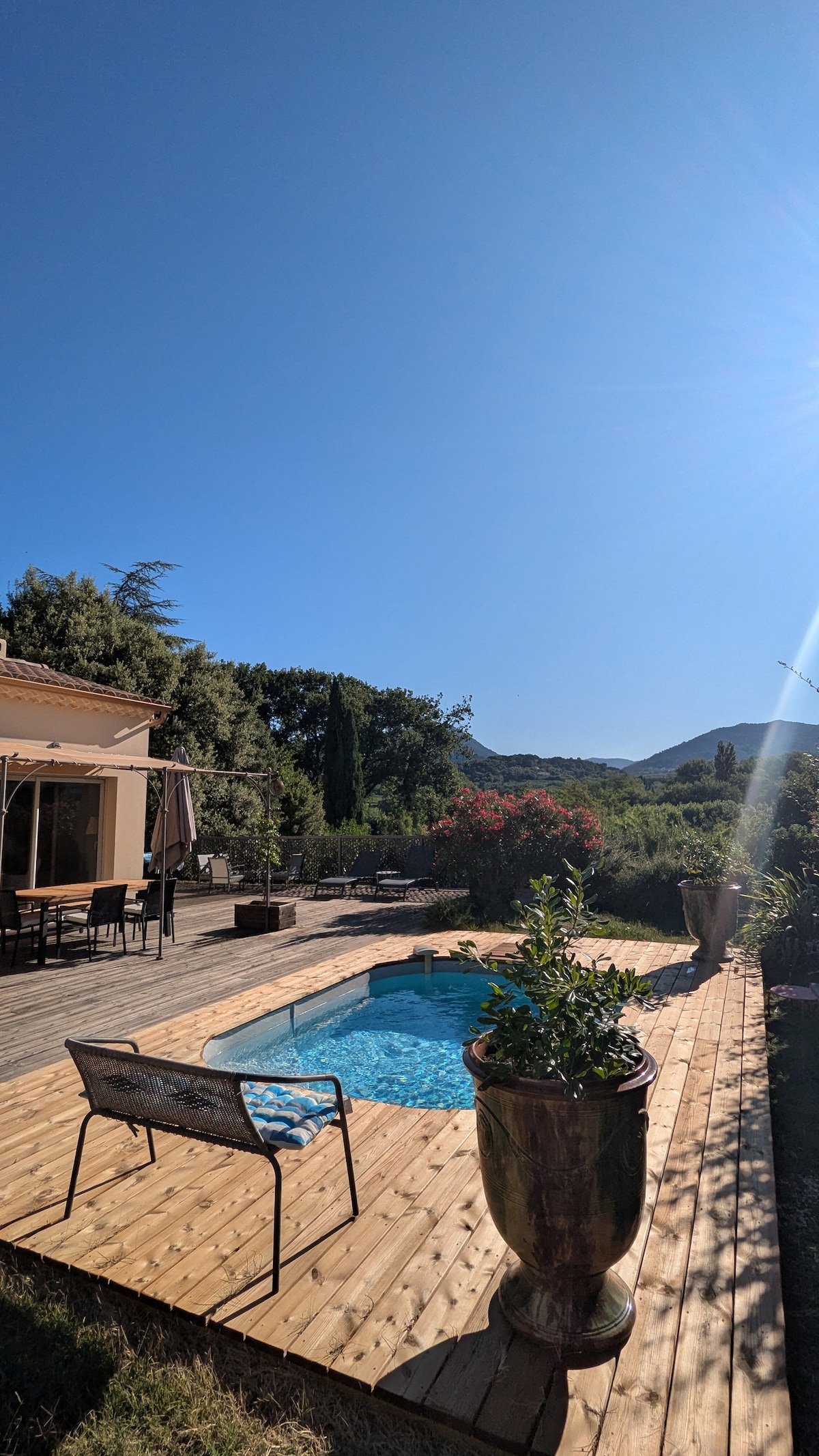 Come and relax in the calm of our architect-designed house, with its magnificent view, backed by the hill and in the middle of oaks and olive trees. Our family home, very bright, is designed to enjoy the coolness in summer and the sun in winter, fully renovated and insulated (interior and exterior) In couples, family with children or groups, you can go hiking or walking or cycling directly from home.