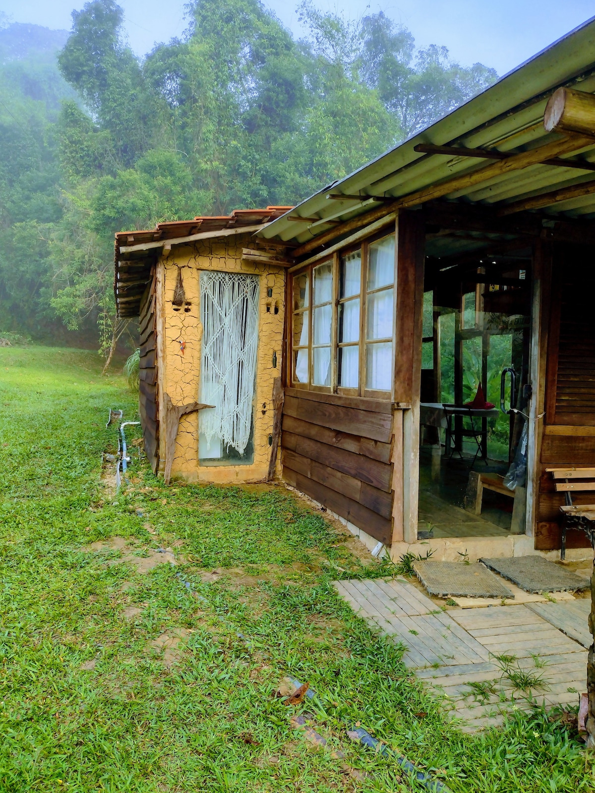 Cozy jungle lodge plus a separate bungalow in the heart of Brazilian tropical rainforest Mata Atlântica. Ideal for bird watching, trekkings, moutain bike, visit to waterfalls, or just chilling in a calm, green outbursted rainforest. Water comes from the natural riverspring beside the house. The house has 2 dorms with beds, bathroom, kitchen with both regular and wood woven and a small living room. The bungalo has a room+bathroom with hot water and a large king size bed. Free Wi-fi (15MB).