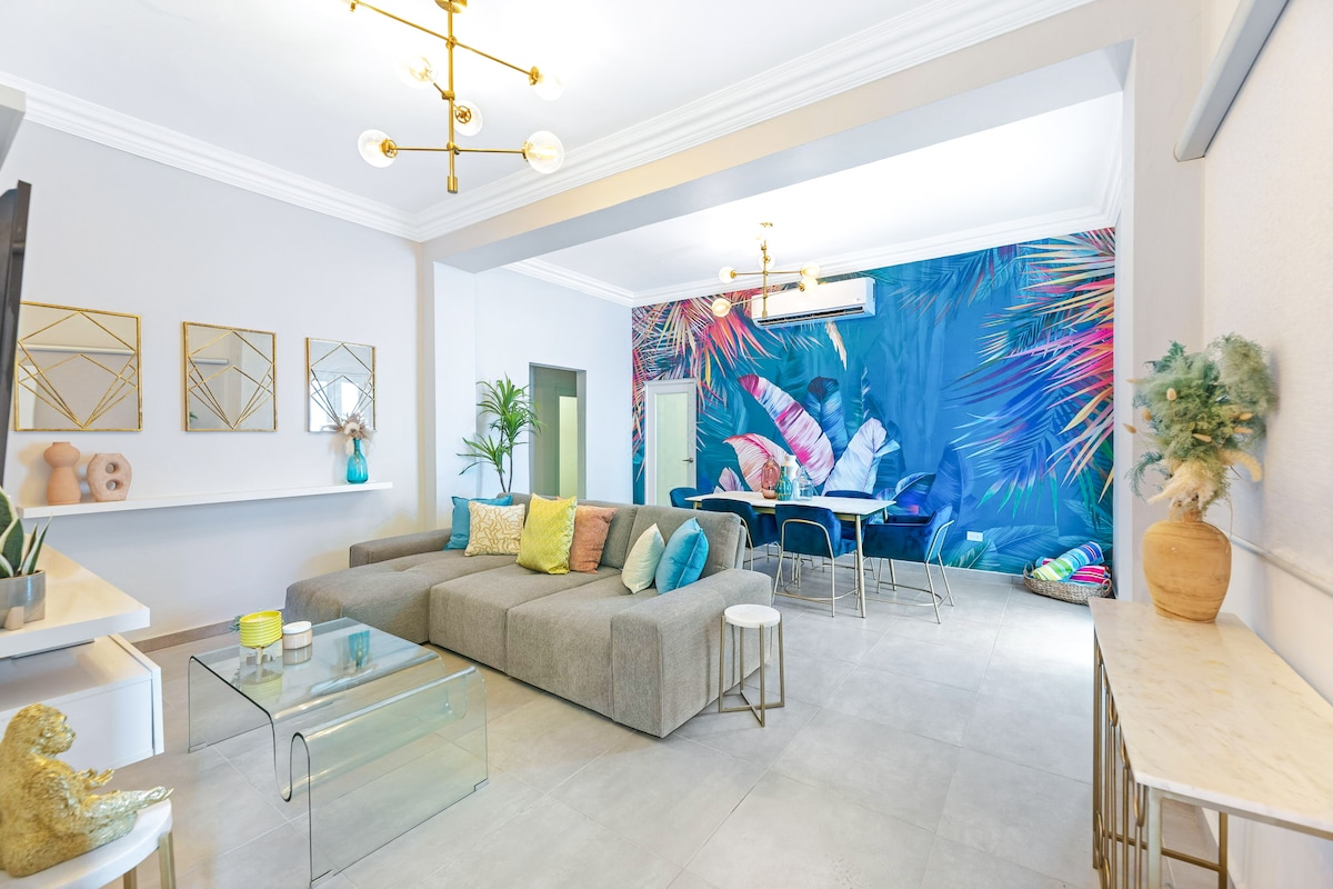 This unique place has its modern-minimalist and chic own style. Our gold decoration bring the space a elegant and sophisticate ambience, spacious, and well located location. Close to everything and at the same time feeling the greenery of our beautiful garden. Walking you have beach, pharmacy, supermarket, restaurants, District T-Mobile, convention center, hangout areas, rooftop and more. The apartment has 2 bedrooms, 1 bathroom, 1 kitchen and living room. There are beds for 6 people.