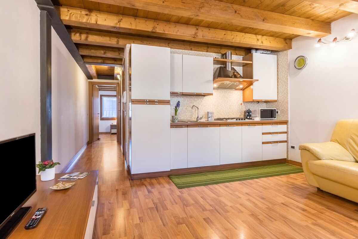 The "Loft Laguna" is a charming retreat in a place where time seems to slow down and every detail tells a story. Located on the ground floor of the historic Palazzo Persico, it has been carefully renovated, blending the authentic charm of country homes with modern comfort. It offers a cozy double bedroom and a bright open-plan living area with a kitchen and sofa bed. An intimate and inviting space, perfect for experiencing a stay filled with elegance, tranquility, and timeless beauty.