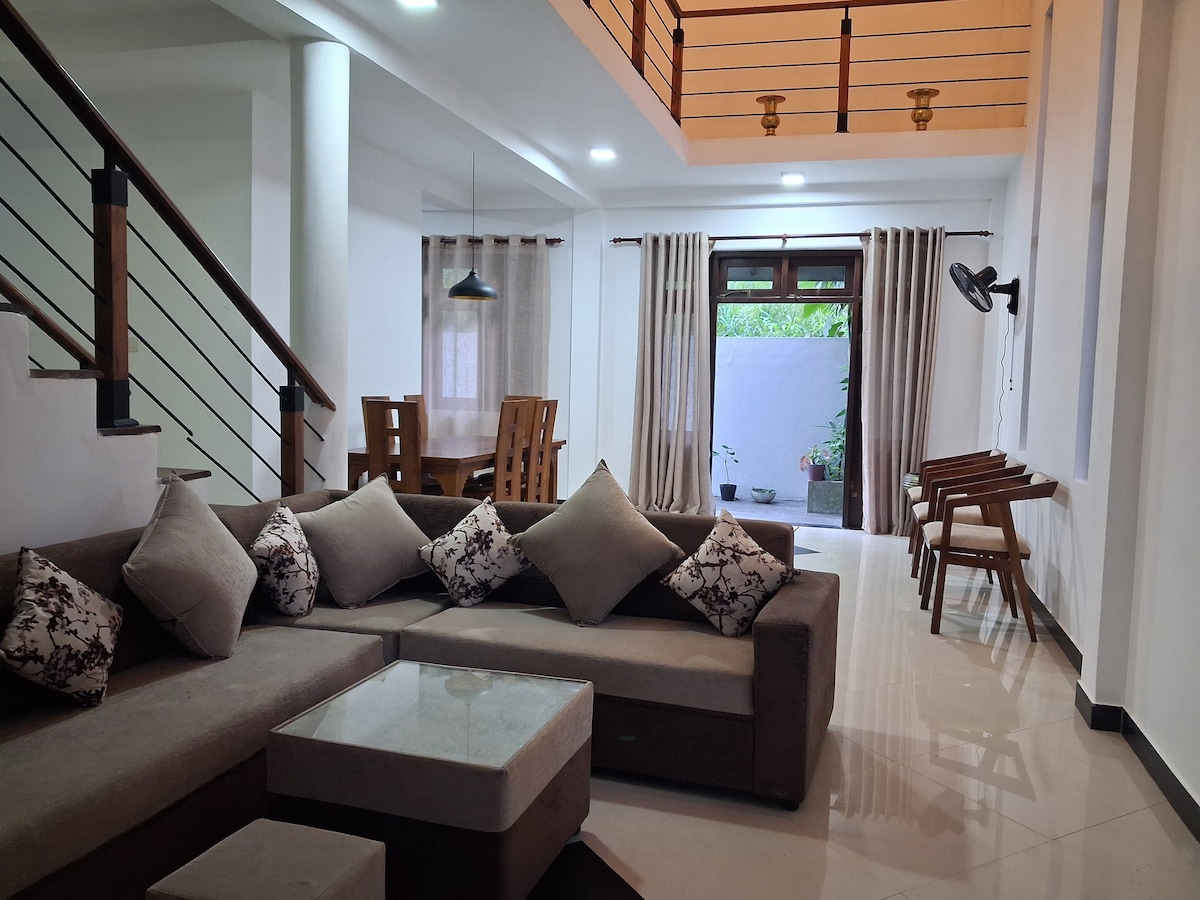 Our private beach house in Hikkaduwa, offers stunning sunset views over the Indian Ocean. 🌅 Enjoy the spacious terrace, direct beach access, and beginner-friendly surf opportunities. 🏄♂️ The house includes a fully equipped kitchen, modern bathroom, air conditioning, and high-speed internet for remote work. 💻 With high ceilings and local fruit & vegetables stores nearby, it combines coastal tranquility with modern amenities for both relaxation and productivity. 🧘♀️