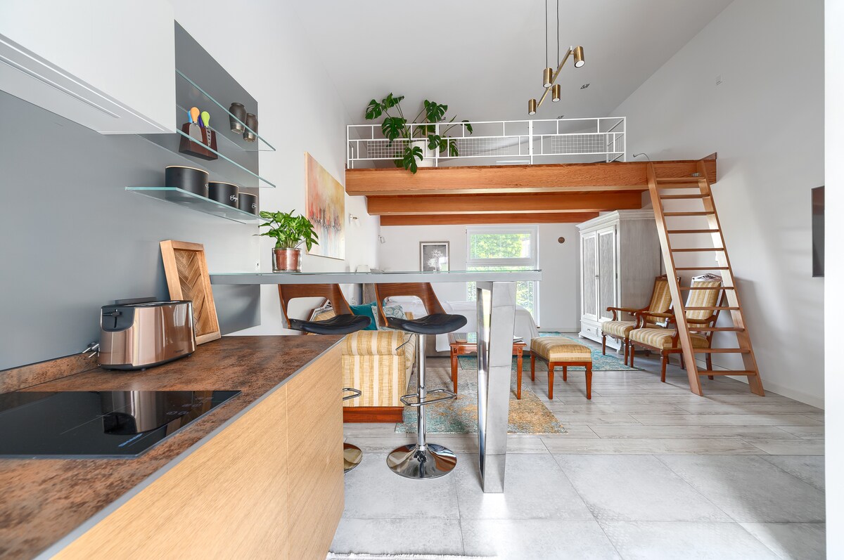 Romantic hideaway in a class of its own Arched by a historic brick ceiling, the cozy nest is located on the garden level of Villa Meeresstern, a historic, landmarked building from the century before last. The unique, recently renovated premises – consisting of a large living-sleeping loft, kitchen, full bathroom and separate wardrobe - offer a fascinating mix of historical and contemporary that will delight design fans.