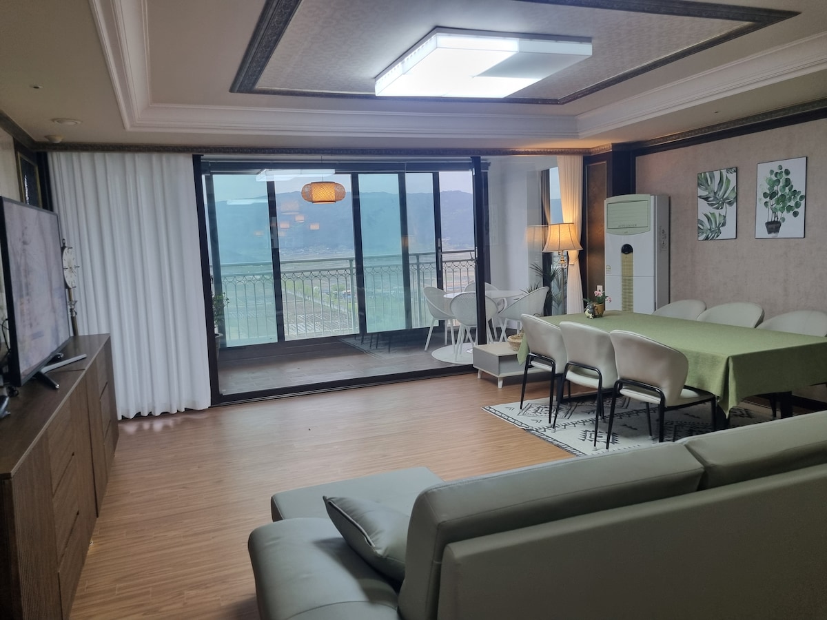 A wonderful yard with a view of the Nakdong River and a train. A fire pit. Jacuzzi and cozy bedroom. Camping available. Barbecue.