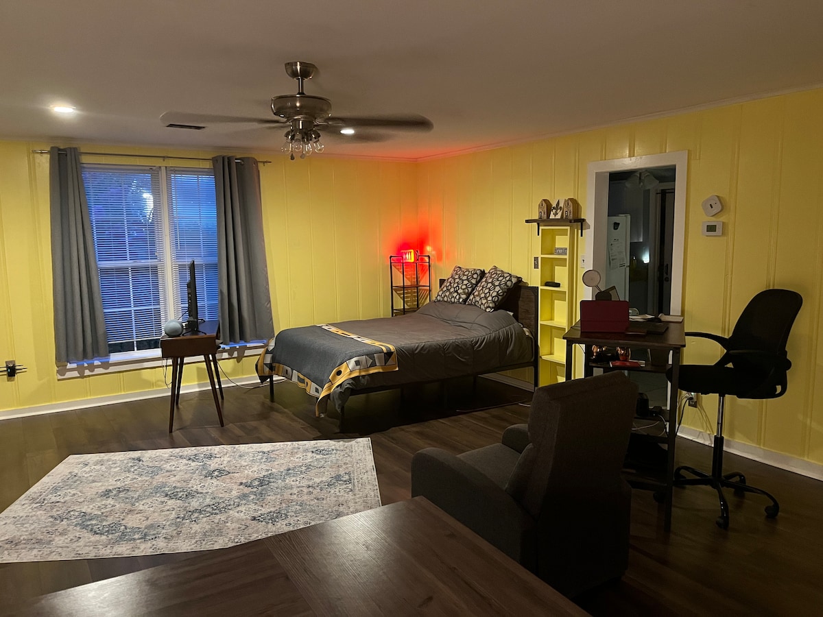 Spacious studio apartment with 10 ft ceilings and tall windows make it bright and airy. Located in a quiet, wooded neighborhood just a 10 minute drive from campus or the Square. Queen-sized bed, dual recliner loveseat, writing desk, bar top dining table, washer/dryer unit, and kitchen with full size refrigerator, microwave, and stovetop. Private outdoor patio that is fenced-in. Personalized door lock code for added security. Roku TV and free WiFi.
