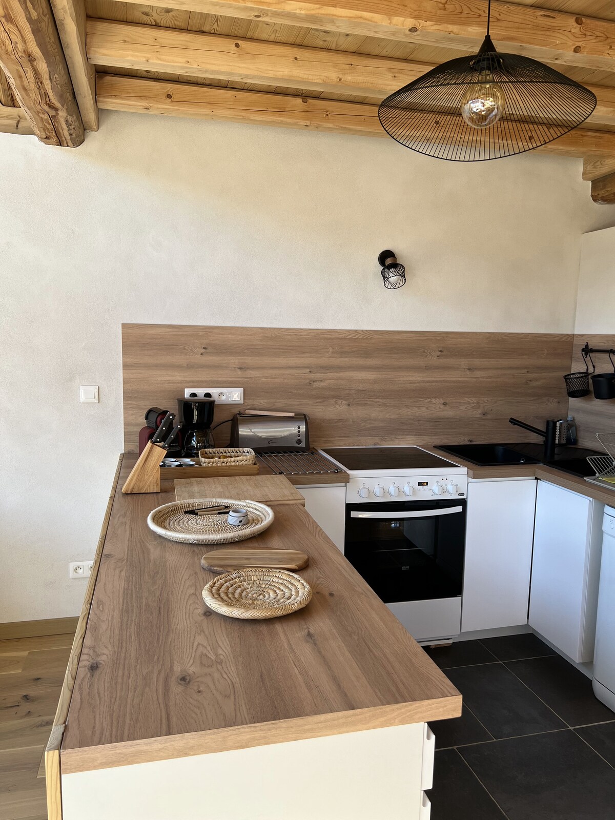 Newly finished modern ground floor suite in local family house with sunny patio/garden/bbq access on the uphill edge of the tiny quiet hameau of Ventelon. One bedroom with queen size bed and single bunk with additional single bed/sofa in living area (baby bed/high chair also available) with views to the high summits. Fully equipped kitchen with induction cooking/oven. Perfect base for direct ski touring/hiking/paragliding access to the fabulous terrain on the sunny side of the valley.