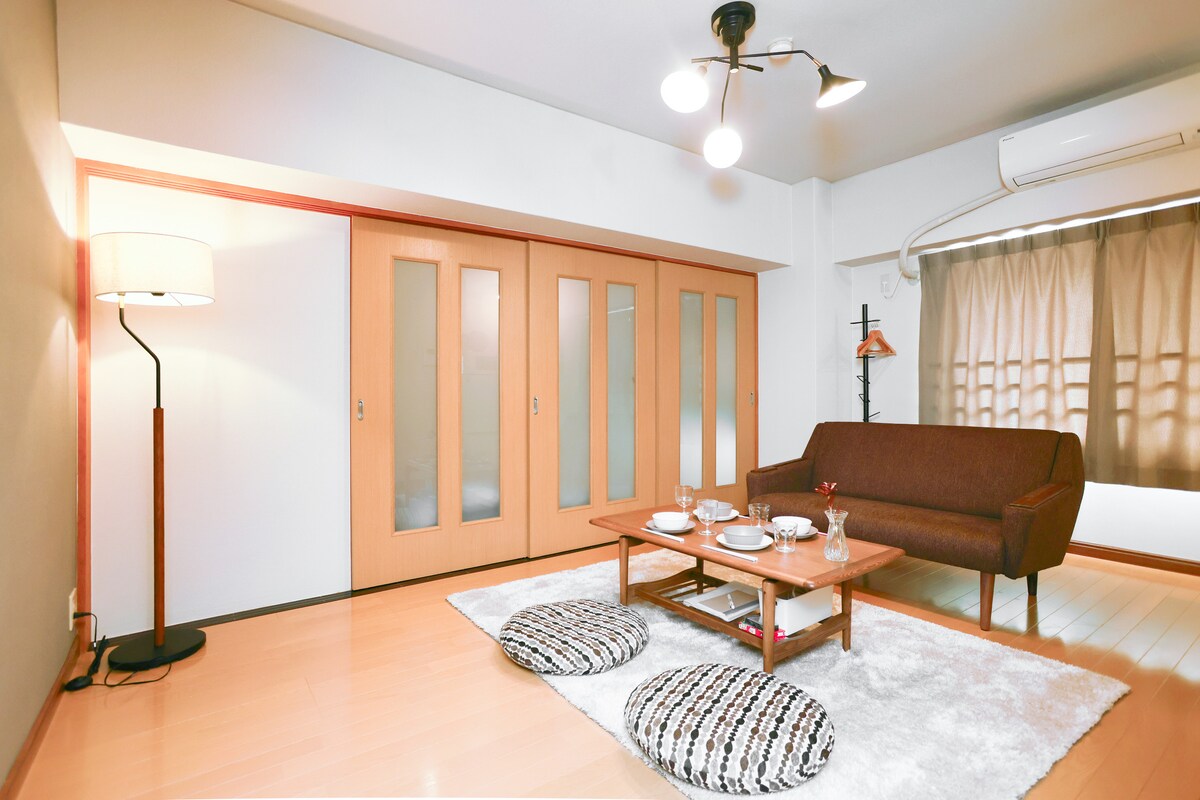 5-minute walk from Fukuoka Tenjin subway station. Renovated apartment. 1 double bed and 1 sofa bed.