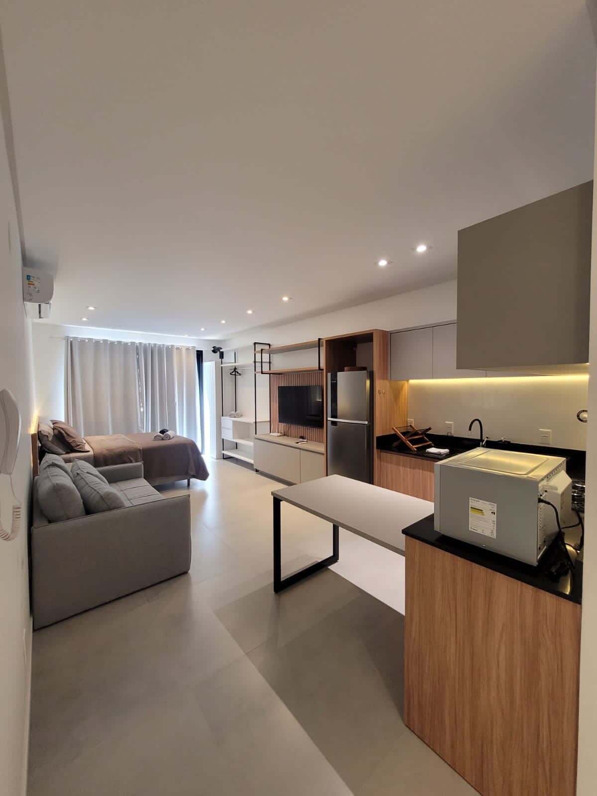 New studio, fully furnished and equipped, in a smart building with unique architecture, located just 100 meters from UFSC. Here you can forget the keys: all access is by facial recognition. Complete structure: 🚲 Bike rack 💪 Gym 👔 Coworking/meeting room 🍽 Gourmet balcony 🌿 Rooftop with lawn Live with comfort, technology and practicality in the heart of Florianópolis!