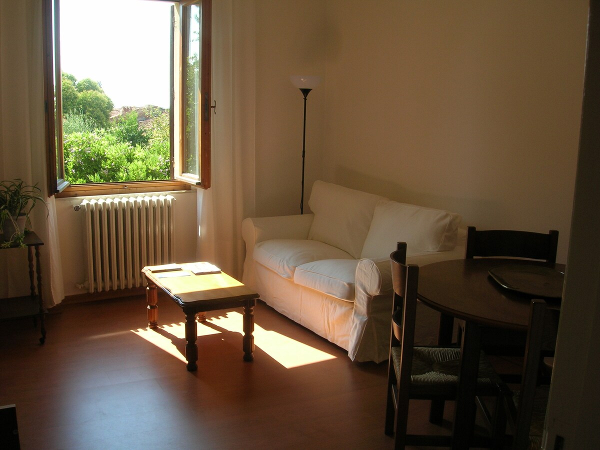 Flat at ground floor composed by living room, kitchen, 2 bedrooms, bathroom, storeroom. The flat opens on a beautiful small square full of trees and towers. It is at 200 meters from Piero della Francesca's frescoes and next to the Cathedral and Piazza Grande where the famous Giostra del Saracino is held every June and September. every weekend of the month, Piazza Grande is also the theatre of the Fiera Antiquaria,a famous exhibiton, where you can find all sorts of old things, from furniture to jewerly, pictures, toys, etc. In few minutes from the house you can reach also Petrarca's house, Vasari's house, you can visit the famous Cimabue's crocifix, the Archeological Museum and the Medieval Museum. Numerous small shops of antique things are all around. The apartment is at 10 minutes on foot from the railway and bus station, a bus stop is also present near the house. Being the house located in the historic centre, access by car is allowed only from 8.00pm to 8.30am and from 12.00am to 4.00pm. Beside this, at 5-10 minutes walking there are several parking areas, both free and pay. Relax and view on the medieval town are the characteristics of the house. Dogs are welcome. They can easily take a walk in the garden square in front of the house.
