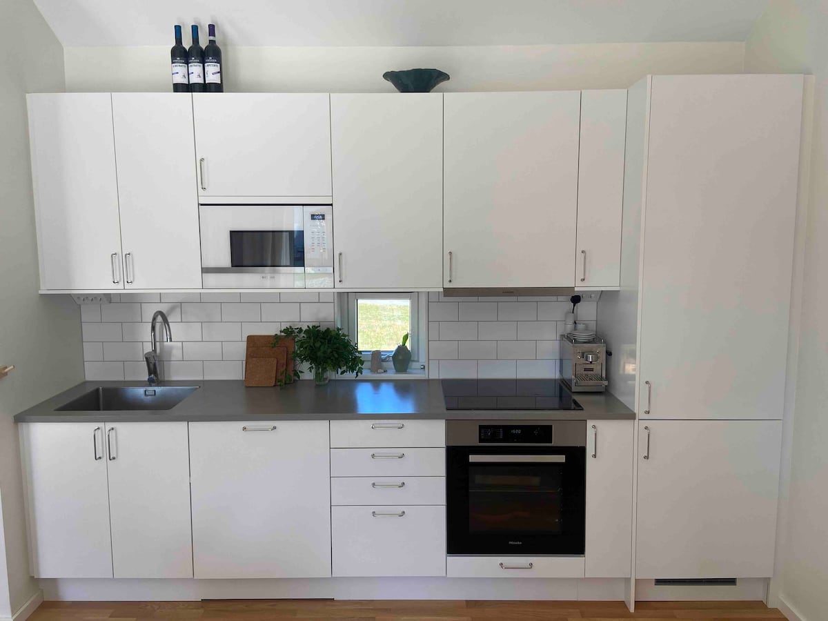 Newly renovated and modern apartment of 90 sqm. The apartment is on the ground floor of a villa, with a separate entrance. - large and spacious hall - fully equipped kitchen (microwave, oven, fridge, freezer, dishwasher, washing machine, etc.) - Living room with fireplace, wood included. -two bedrooms with 4 beds - South-facing patio with beautiful views of meadows and mountains. The location of the accommodation provides proximity to the sea, forest, and lakes. It is within walking distance, 2 km, to Hälleviksstrand's swimming area. There are also restaurants, a kiosk, sauna and paddle tennis.