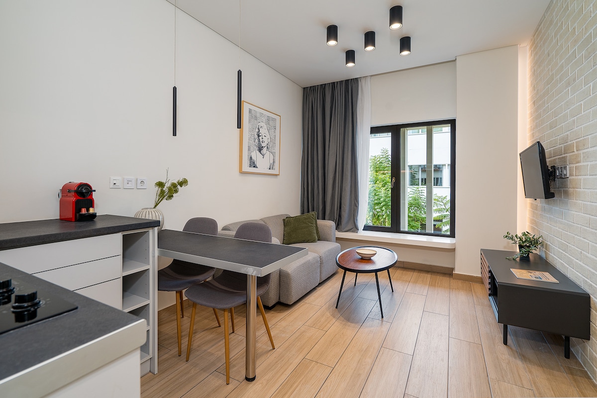 This industrial-style apartment designed by an architect offers style, comfort, and convenience. The living room features large windows, a cozy sofa, smart TV and high-speed Wi-Fi. The kitchen is fully equipped with modern appliances, utensils and dining table for four. The bedroom has a king-size bed, plenty of closet space, and natural light coming in from the open-plan. The bathroom has a walk in shower and washing machine. Additionally, enjoy my PS5. Sadly the Marshal speaker was stolen.