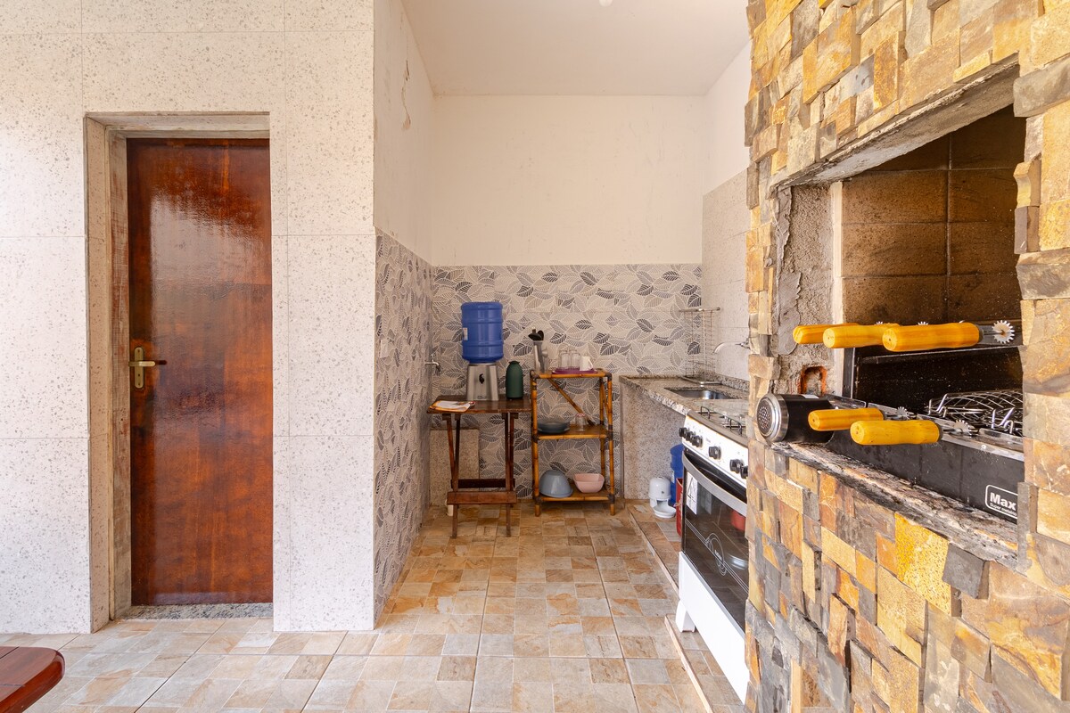 Private space for guests, swimming pool with waterfall, bathroom with hot shower, cold shower next to the pool, refrigerator, stove, electric oven, electric pan, air fryer, dishes and cutlery, barbecue and barbecue kit. We serve portions: shrimp, calabrese sausage, fried chicken, french fries, (not included in the daily rate) Private, dead-end, paved street, 10 min. walk to the beach. Note: The owner lives in the house in front, the small house is in a reserved and private space for guests. .