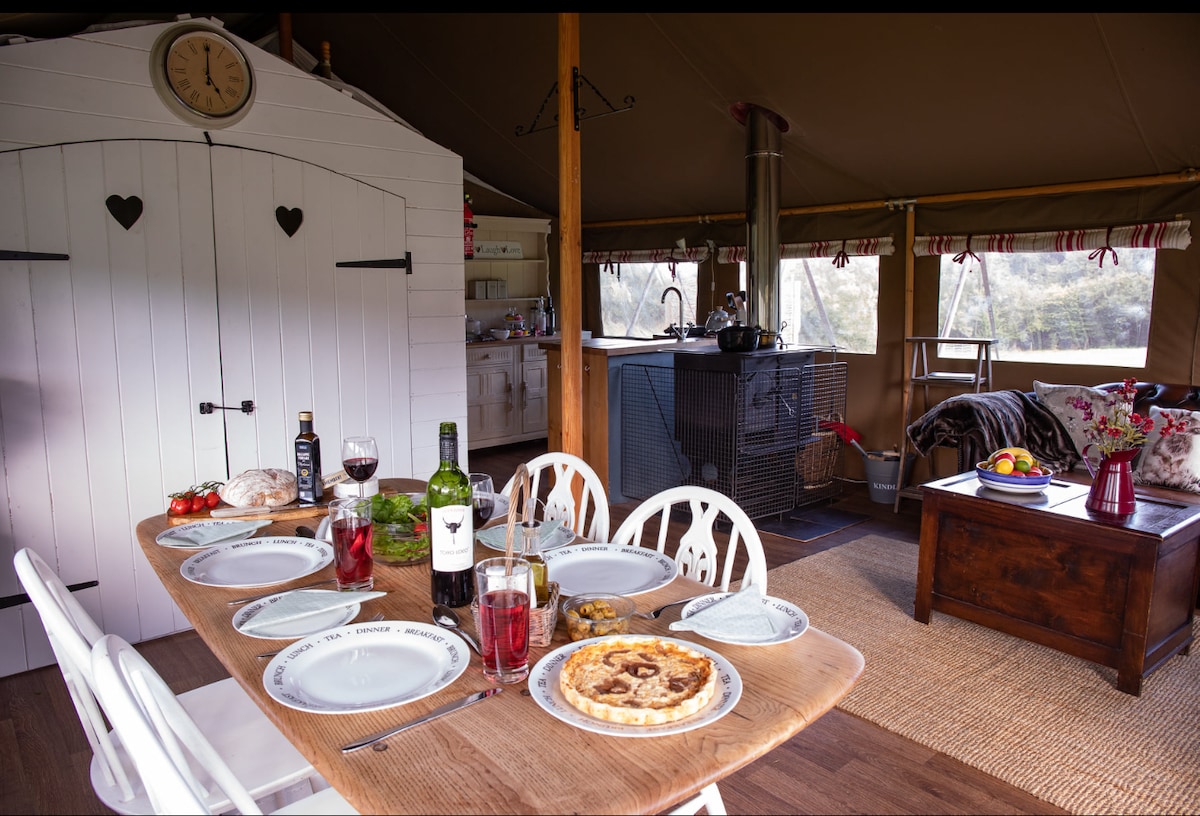 You'll love this unique and romantic escape. Large 6m x 6m Luxury Bell Tent in the most idyllic location with its own private small river running through its grounds , private , tranquil and unmatched views right on the England / wales border . This unique one off Glamping experience has won our site a Triple award by guests . Enjoy the super soft furnishings along with a king size bed and room to accommodate up to 6 people comfortably . Barbecue hire , fire pit hire & parking within 10 feet