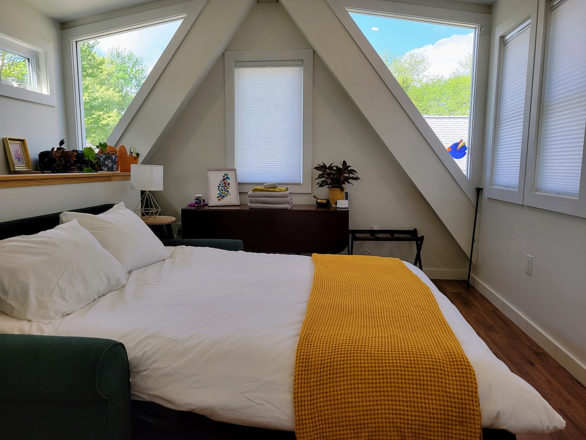This little granny flat is an inspiring, light-filled space with all of the basics, located in a friendly neighborhood, and literally steps away from the host house. With one bed (an American Leather pullout coach in a full queen size) and a full bathroom with shower upstairs, and kitchenette and living space downstairs, you'll have everything you need for a comfortable stay. We are located a few blocks from a coffee shop, and an easy one mile walk from downtown Bloomington. All are welcome!