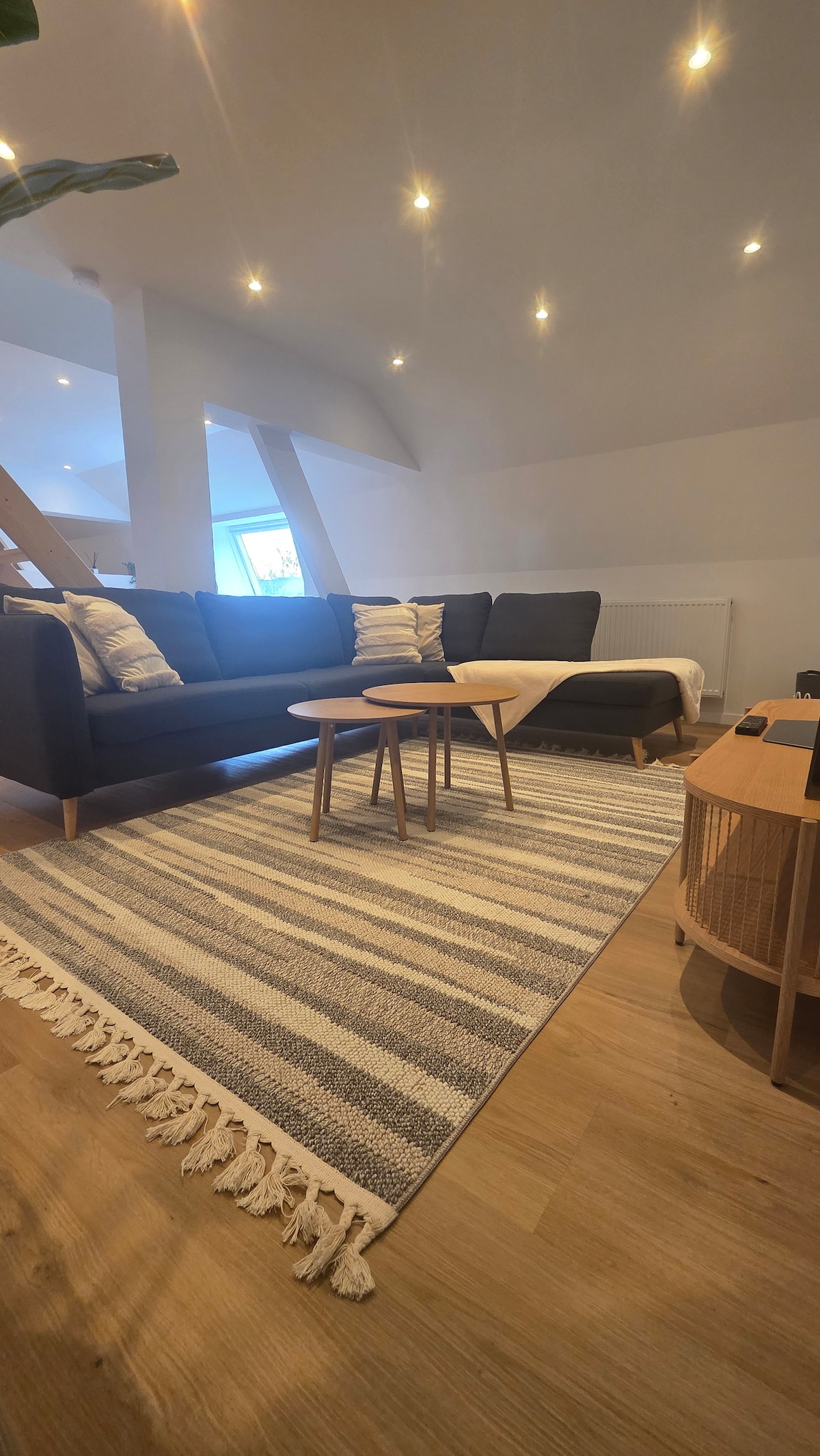 Notre duplex de style moderne vient d'être entièrement rénové et est totalement équipé. Situé en centre-ville, il reste un endroit relativement calme à l'arrière du bâtiment (magasin "créaflors"- cour arrière). Notre logement de 70m² s'organise sur 2 niveaux avec tout l'équipement nécessaire : salon, salle à manger, cuisine totalement équipée, grande chambre avec coin lecture, salle de bain avec baignoire et douche. Il est idéalement situé au centre de Couvin avec parking gratuit à côté.