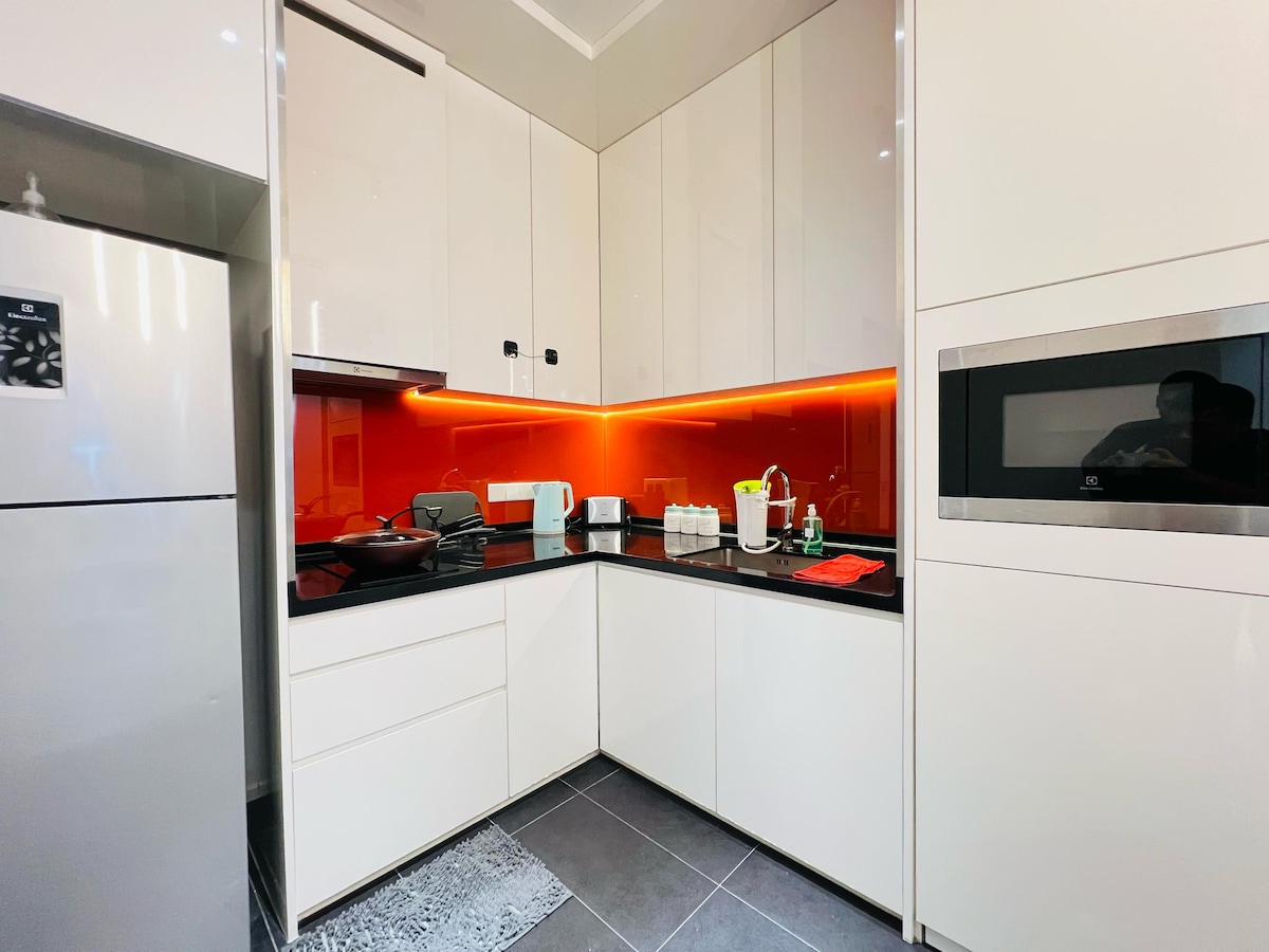 Escape to our romantic corner unit in Dorsett Residences Sri Hartamas — where two walls of floor-to-ceiling windows frame the KL skyline from bed. Unwind in a marble bathtub with complimentary bath salts, cook in a private kitchenette, or play board games over candlelit dinners at the intimate dining nook. Cool off in the rooftop infinity pool at sunset, hit the gym, then come home to warm ambient lighting and a cosy sofa. The perfect couples' retreat in the heart of the city.