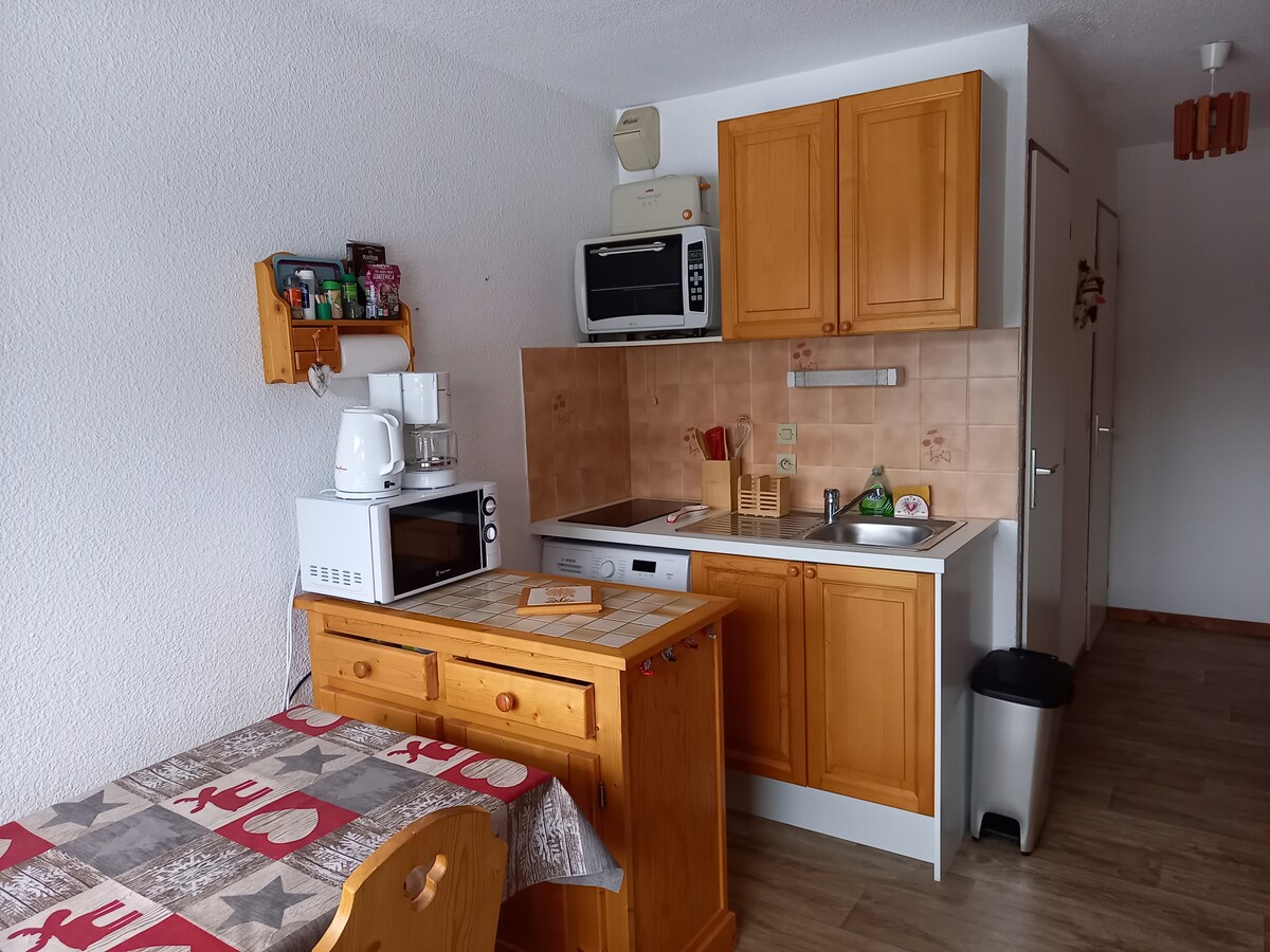 Quiet 24 m2 apartment, view of the Aravis facing South West – Free parking Located 30 m from the ski bus and 5 min from the "Les Charmieux" ski lifts - 50 min from Lake Annecy - 1 bedroom with closet - 1 balcony - 1 sofa bed Amenities - Kitchen: oven - induction cooktop - large refrigerator with freezer compartment - microwave - 1 coffee maker - 1 kettle - 1 washing machine - 1 raclette machine - 1 hair dryer - 1 vacuum cleaner - ski locker - 2 duvets Linens and sheets not provided