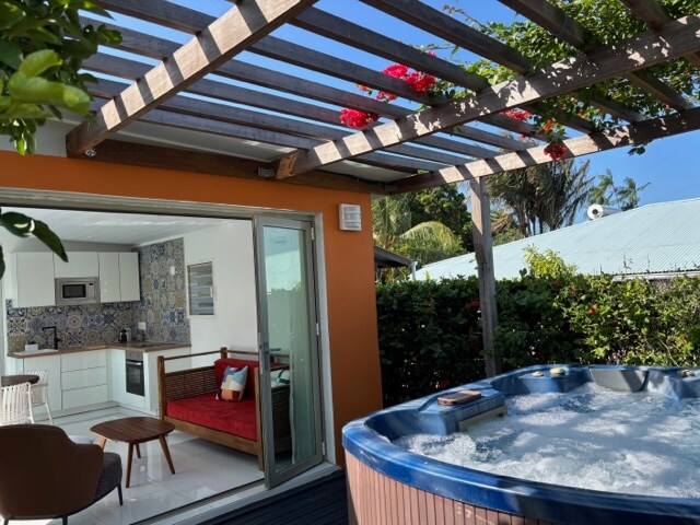 Cozy apartment, new, air-conditioned and relax in a king size bed with TV and a large sofa bed with 65" TV. Close to the village, airport, big shopping mall 20 min away. The 15 m2 terrace for smokers with a jacuzzi for 2 to 4 people and 2 parking spaces. Overnight stay for 4 people/min. 1 night. Weekly or monthly, decreasing price. Check-in between 1 p.m. and 9 p.m./check-out between 6 a.m. and 11 a.m. The entrance and exit are autonomous with a key box. We are classified 3 stars.