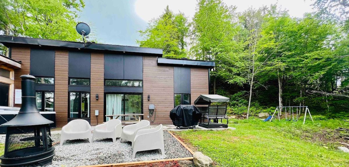 New modern farmhouse-style cottage, sleeps 8. Both rustic and spacious, it is located in the middle of nature on a mountainous terrain, on the edge of a stream and a small private lake* where it is pleasant to swim This beautiful chalet will charm you for sure, with its beautiful windows projecting a most soothing decor. * Only the owner and their family also have access to the lake occasionally *