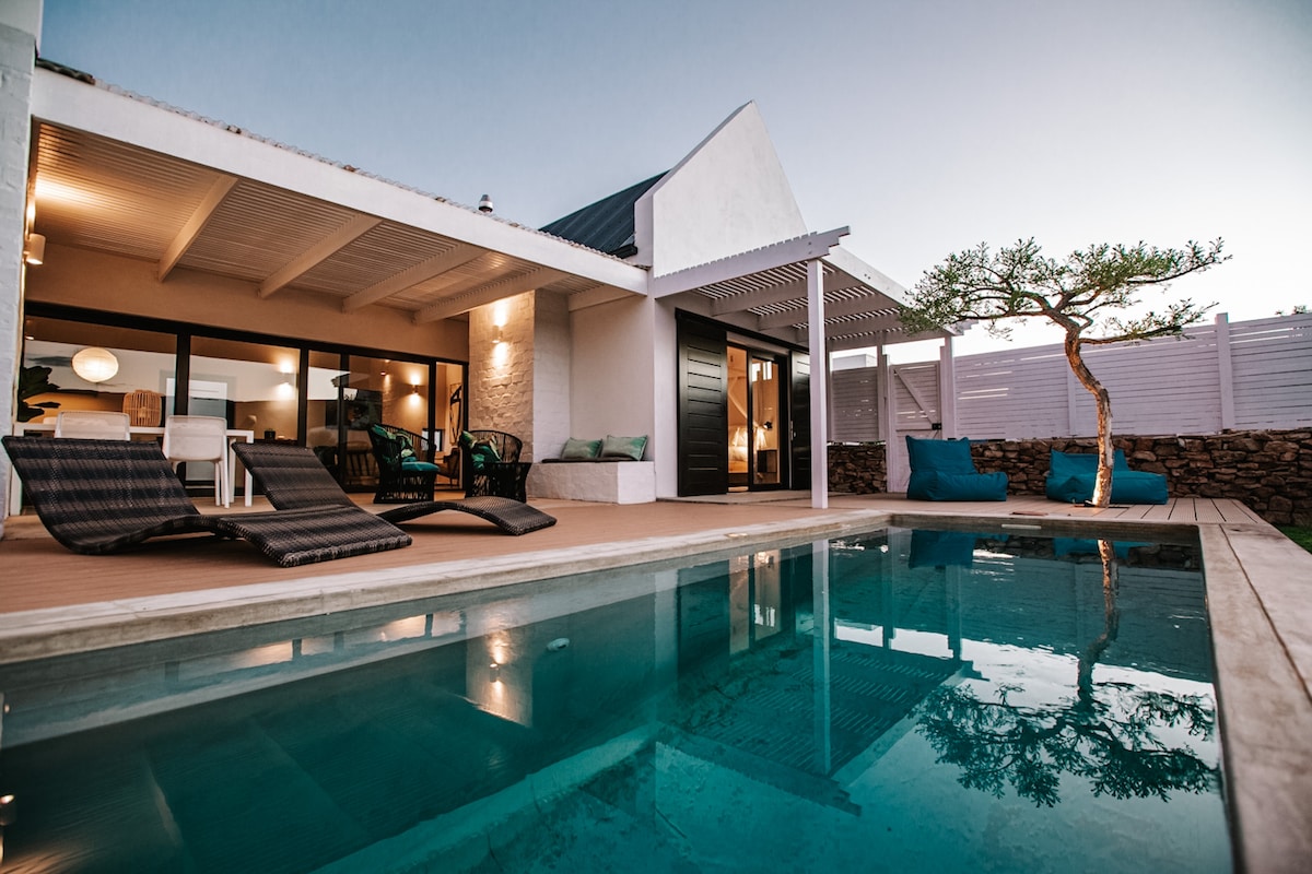 In this beautiful valley lies a stunning minimalistic, off the grid studio house, with heated outdoor pool Off the grid living is a unique experience, with borehole water and solar power Solar power is limited so if you hit a cloudy spell, romantic candles can be used Uninterrupted mountain views A wide variety of outdoor activities, including hiking/biking Stove, geyser and heater are gas powered. No Wifi/Tv High clearance vehicle recommended