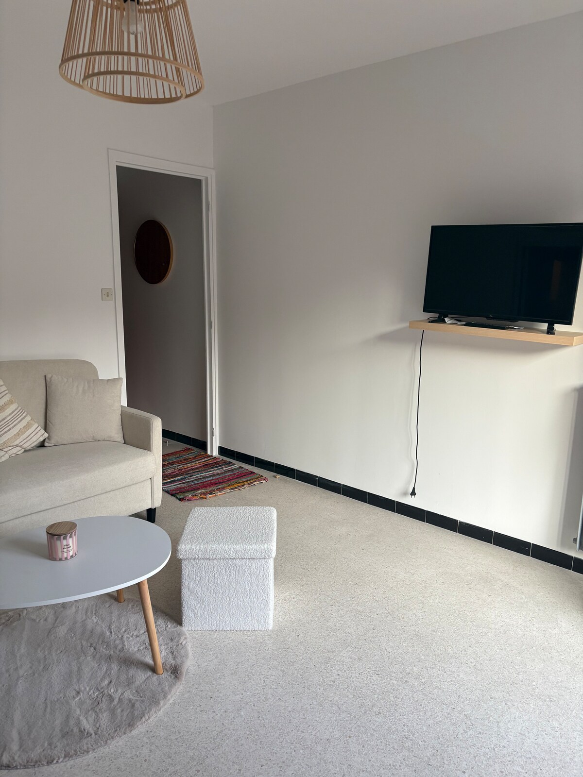 F2 with balcony, 40 m2 CITY CENTER quiet street. New, very bright. Air conditioning in the living room and bedroom, 1 double bed in the bedroom measuring 160 x 200 cm + sofa bed for daily sleeping, washing machine, dishwasher, Wi-Fi. 40 m from the beach, shops, restaurants, local and night market, SNCF train station, sightseeing boats. Secure parking upon request only. Baby cot available for free upon request To contact me, see the photo of the keychain.