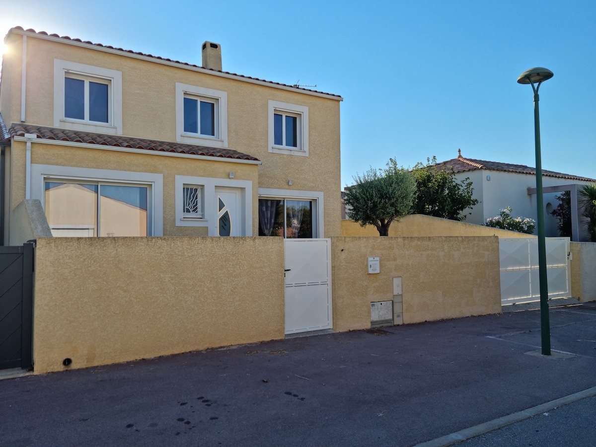 2km from the center of Grau d 'Agde and 800m from the beach (bike path), small villa (35m2) independent F2 located in a family property. Secteur camping Les Sablettes accommodation composed of _living room with equipped kitchen, convertible to 140 cm (ideal for children), table and chairs _ bedroom with bed 140 cm, TV. _ en-suite bathroom to bedroom with Italian shower _80m2 walled garden with parking space and equipped terrace. -clim and wifi - towels and linens provided