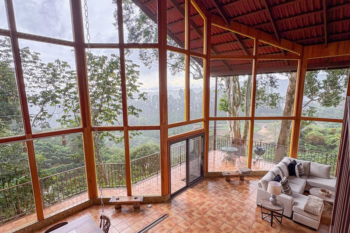 Welcome to the Coffee Cabins. This is one of four stunning A-frame cabins perched on the side of a mountain in the middle of a coffee field. You’re literally surrounded by coffee, both on the trees and in your kitchen with the complimentary coffee grown right here on the farm. Enjoy larger than life views to both the north towards the continental divide and to the west framing Volcan Baru, Panama’s highest peak.