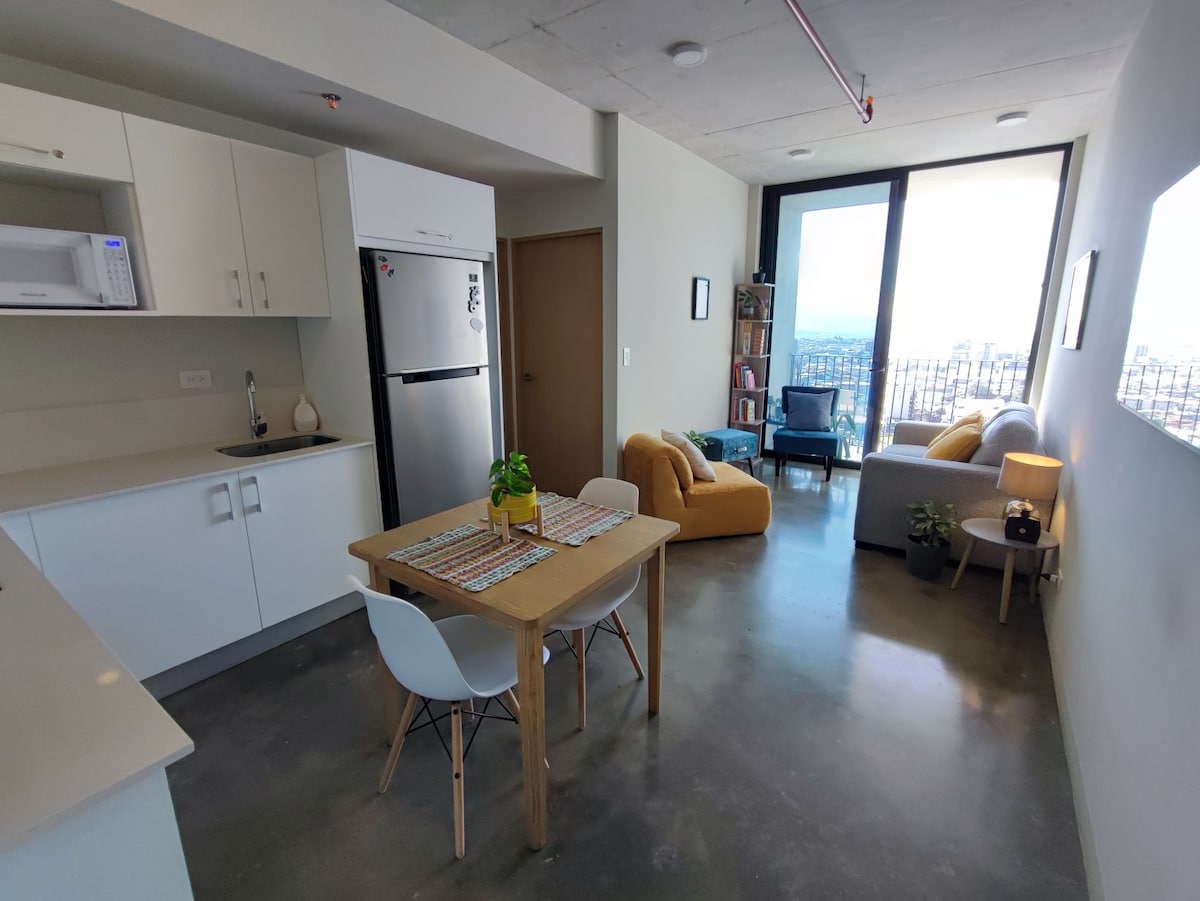 Brand new studio with the best location in town. Comfortable and cozy studio apartment with fully furnished kitchen, dining table, works pace, queen bed, one full bathroom, living area, indoor parking and balcony. The apartment is in a brand new 29 story building, with many social areas and amenities: gym, pool, yoga studio, laundry area, library and the lounges and work spaces with literally the best views of the city.