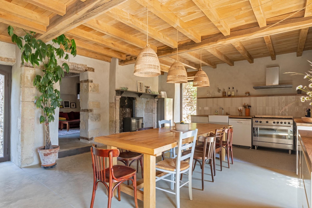 Enter this home renovated by an architect and find a contemporary layout that is both refined and comfortable. Stones, exposed beams, raw and natural materials, workshop partitions, this family vacation home is extremely bright. Built in 1914, this former winery has vinified hectoliters of wine in its vats for 100 years. You will enjoy the barbecue, the private pool with its wooded park overlooking the wheat fields in the heart of GERS