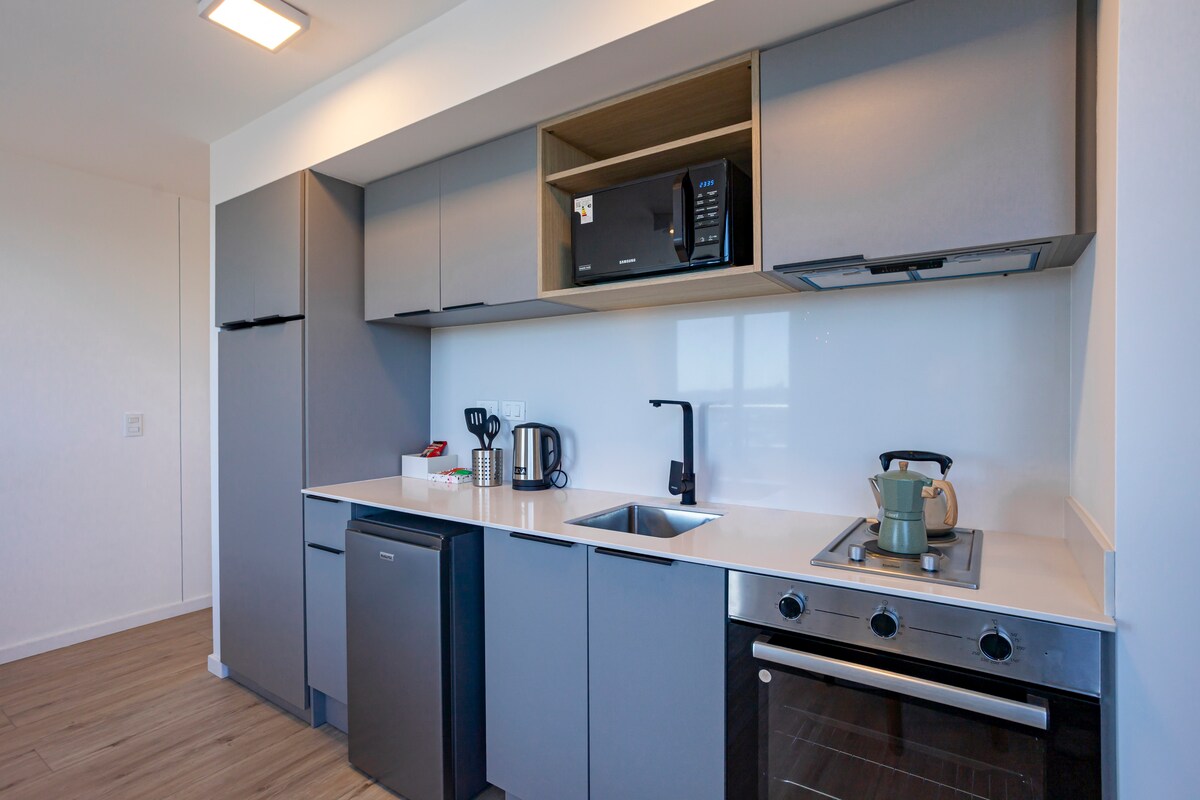 Welcome to this quiet and elegant space in the new MORE ECHEVARRIARZA building. A finely designed studio for both rest and work, making it the perfect place for your trip. With everything you need to enjoy a very comfortable stay, specially equipped for long stays. With the plus of a large patio with table and chairs to enjoy silence and your privacy outdoors. Gym, heated pool, laundry, barbecues, bikes and coworking.
