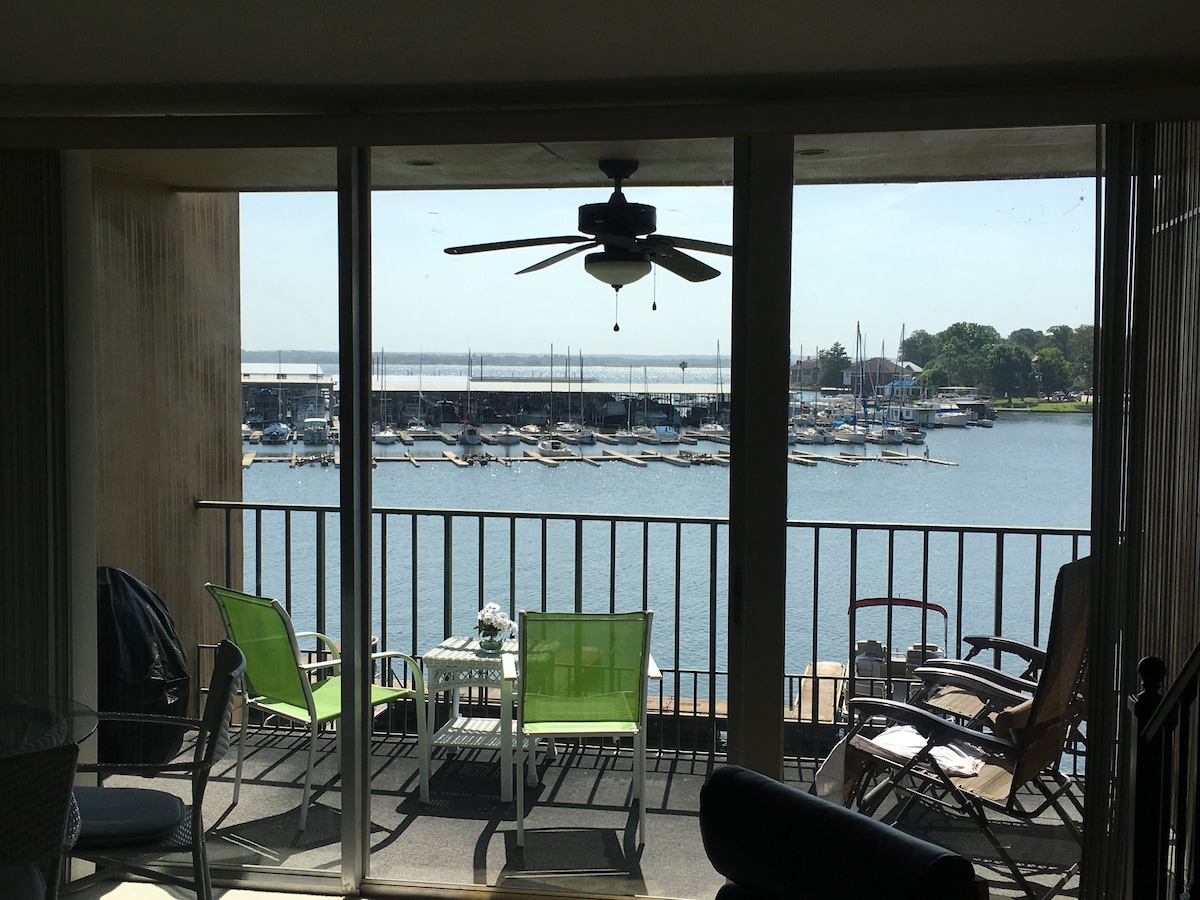 Gorgeous top floor Lake Conroe condo with free access to boat slip, boat ramp, kayaks, Yacht Club dining and pool, Racquet Club tennis, heated lap pool, fitness center, Lakeside Grille with live music. It's located in the closest building to the lake with the best views and the biggest size in the entire complex. Large kitchen and vaulted ceilings. Previous guests loved how clean our condo is, ideal location, beautiful view, and the many amenities plus boat rentals, golf, walking/biking trails.
