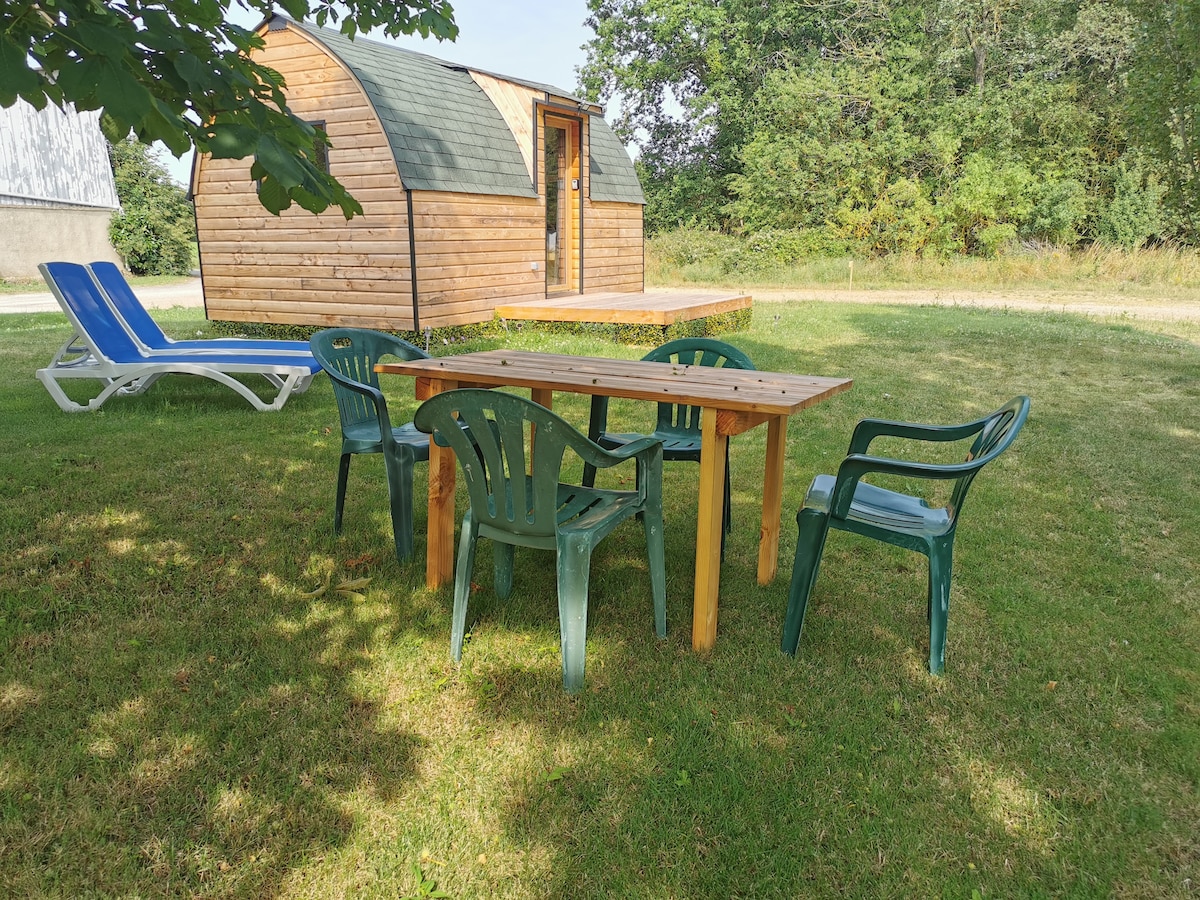 Nestled in the heart of the fields and woods, our wooden cabin invites you to a peaceful and cozy stay. Here, the weather slows down and it's not uncommon to see deer or books when waking up. Enjoy the private hot tub from April to October (adjustable depending on the weather) for a relaxing moment, under the stars. Discover our open-air pork farm, meet the animals for an authentic moment (free tour depending on availability). Terrace, quiet, forest... Ideal for a romantic or family stay.