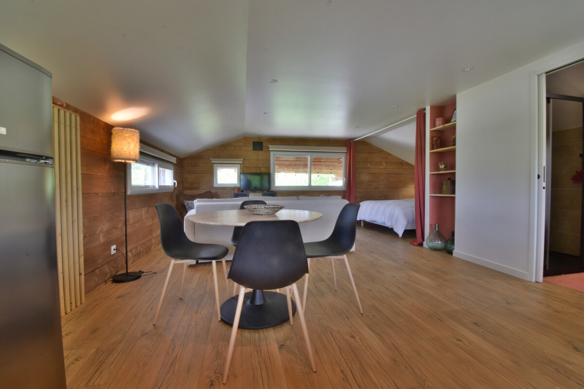 Small 20 m2 house, in the countryside. Carefully restored, it includes a living room equipped with a double sofa bed, a kitchenette and a warm chalet-style bathroom. It has a wood-burning stove. It benefits from a shaded area equipped with a barbecue and garden furniture and a space that opens onto a wide countryside landscape. A stream along the meadow, hiking trails and the nearby medieval village invite you to take a walk.