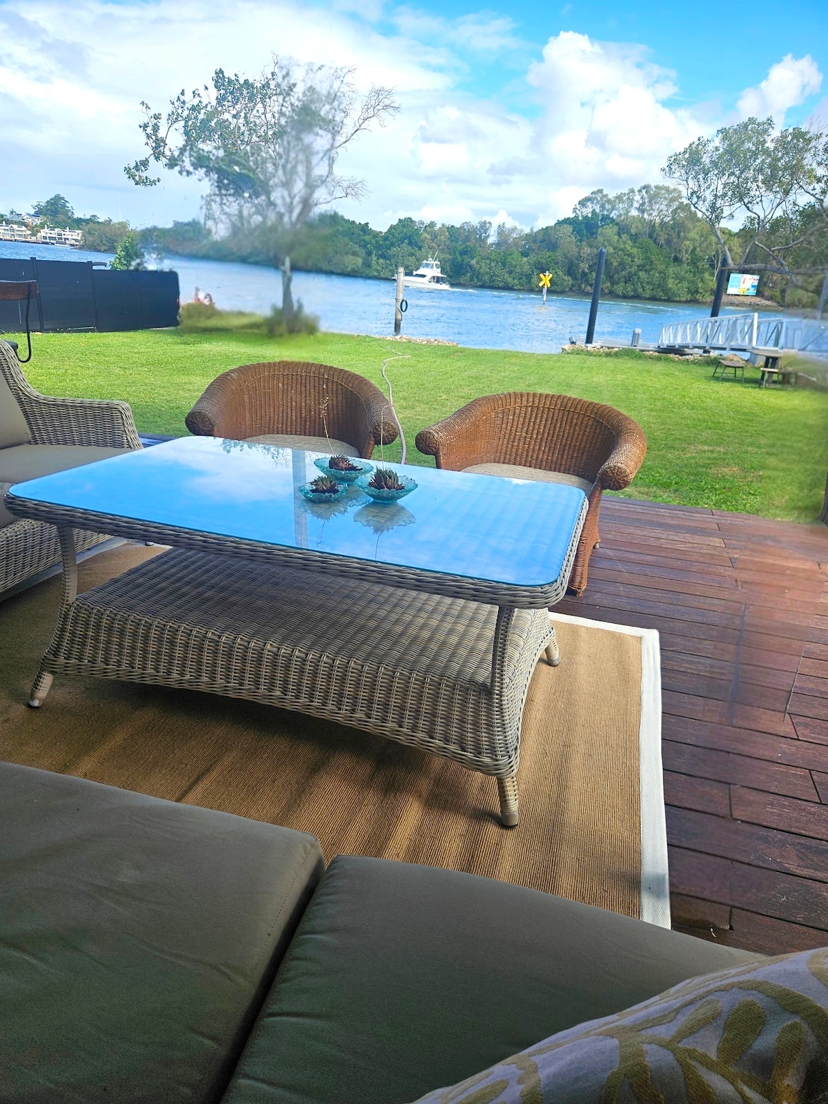 This clean, comfortable 4-bedroom, 3-bathroom retro Palm Springs inspired home is ideal for families or groups who value character over a generic modern build. Set over 2 levels with a fully fenced, west-facing waterfront backyard, over 18m of wide water frontage for undercover sunset drinks and direct access to a sandy beach. Quiet street, double garage, 5 min to Pacific Fair, The Star casino, Broadbeach dining and beaches. Outdoor, well-behaved pets welcome (outdoors only, approval required).