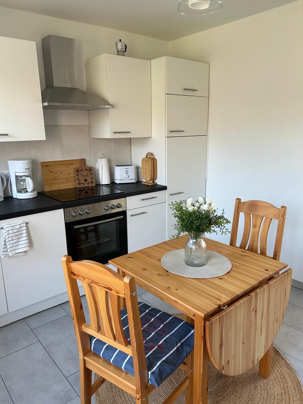 Oma's Huus – 95 m² apartment in a country house in the heart of East Frisia! Two floors. Perfect for 2-4 people. Short stays for up to 7 people possible. You can expect a country house kitchen with real wooden floorboards and a view of your own garden, furnishings with attention to detail and a feel-good factor. With a view of our chickens. Due to its central location on a main road, traffic noise can be heard. However, the property impresses with its secluded location and natural garden.