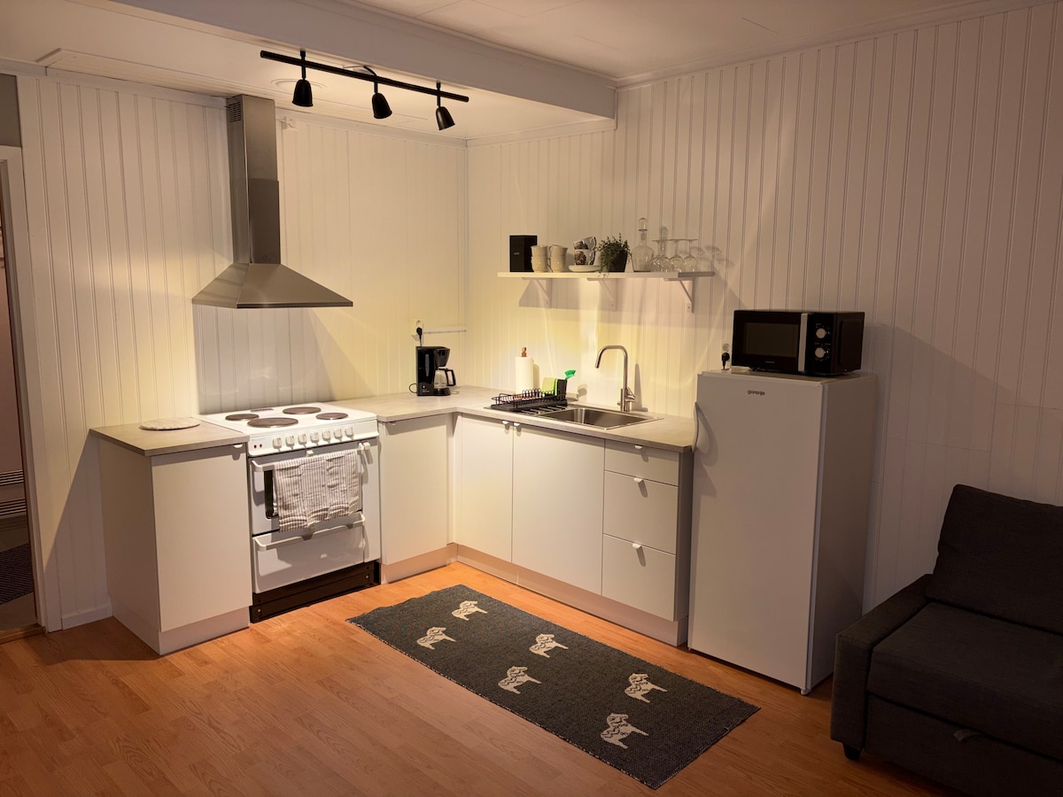 4 guests. Newly renovated two-room apartment, 60 sqm with full kitchen. Apartment located in a turn-of-the-century house on the lower floor. Private entrance. Kitchen with stove, oven, microwave, fridge with freezer. Tiled bathroom with underfloor heating with shower/toilet. Bedroom with double bed and wardrobe. Living room with sofa bed, dimensions: 140 x 200. 2 armchairs, dining table with chairs. Wireless WiFi. Hall with wardrobe. Duvets, pillows and blankets are provided. Bring sheets/towels (available for rent). Skiing in Grönklitt, 15-minute drive. NO PETS/NO SMOKING.