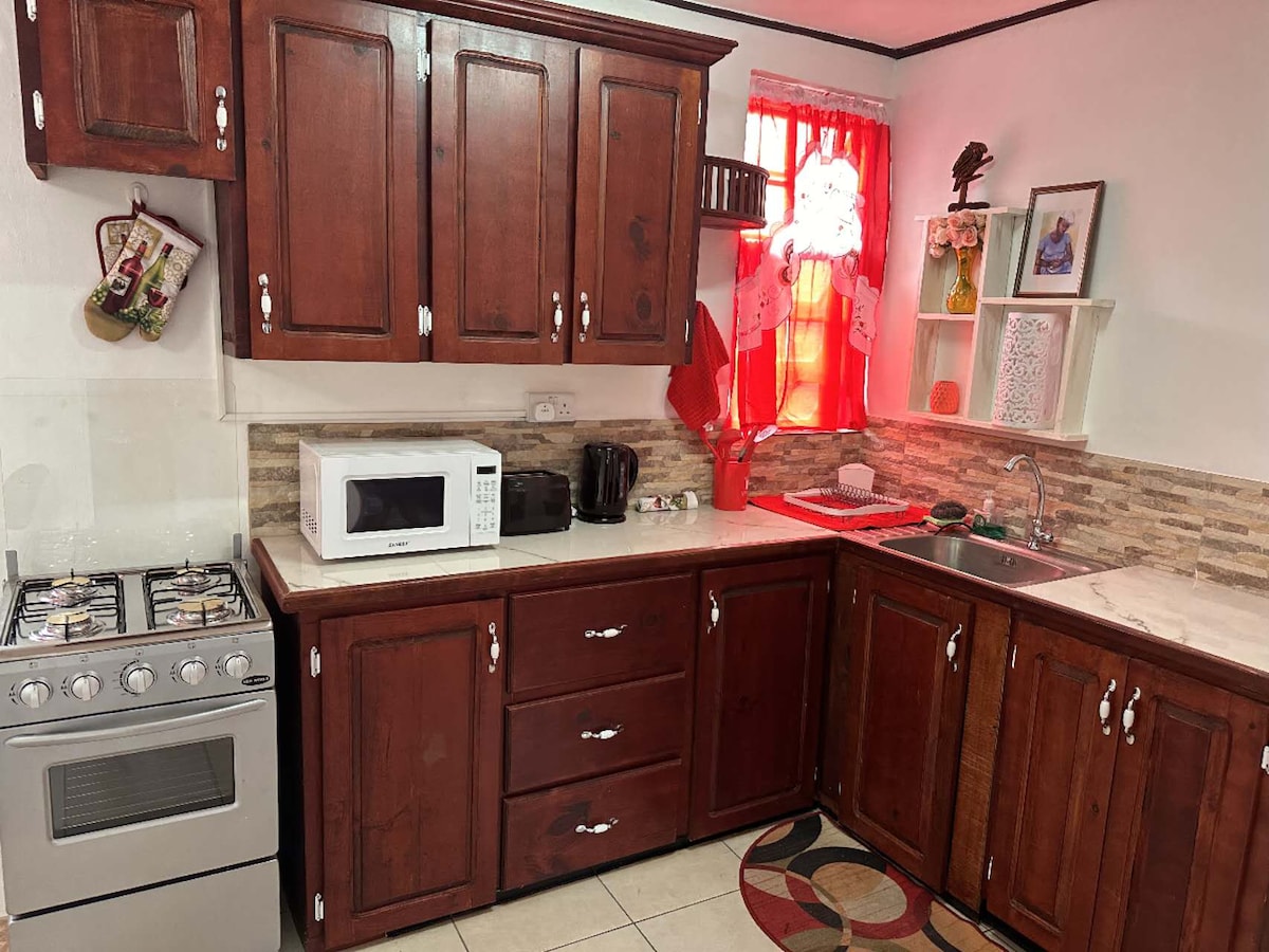 Get straight to work, Vacation or Fete at this peaceful, centrally-located modern Apt. The Apt is always perfectly clean and maintained. Being 1 to 5 minutes from multiple supermarkets, the premiere Health Store, pharmacies, the General Hospital, playing field with bball court and walking track, the Botanical Gardens and the National Stadium, this modern, newly built apt is a rare find and in a class of its own. Features modern appliances, ceiling fans, window views and secure entrance.