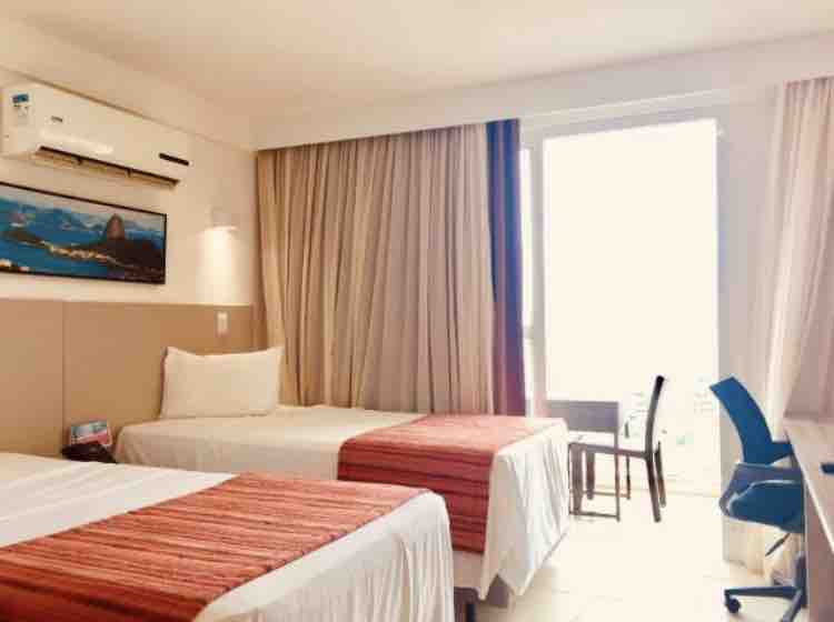 Sunrise flat with a sea view, located on the 13th floor of the Hotel Ramada, Imbetiba. It has two single beds (being larger than a normal single bed). The room has a bathroom with a sink outside, a 40-inch LED TV, Wi-Fi, workbench, chair, wardrobe, kitchen sink, minibar, microwave, coffee maker and sandwich maker. It has a balcony with a sea view, with a table and two chairs. It is 400 meters from the Petrobras base and the beach.