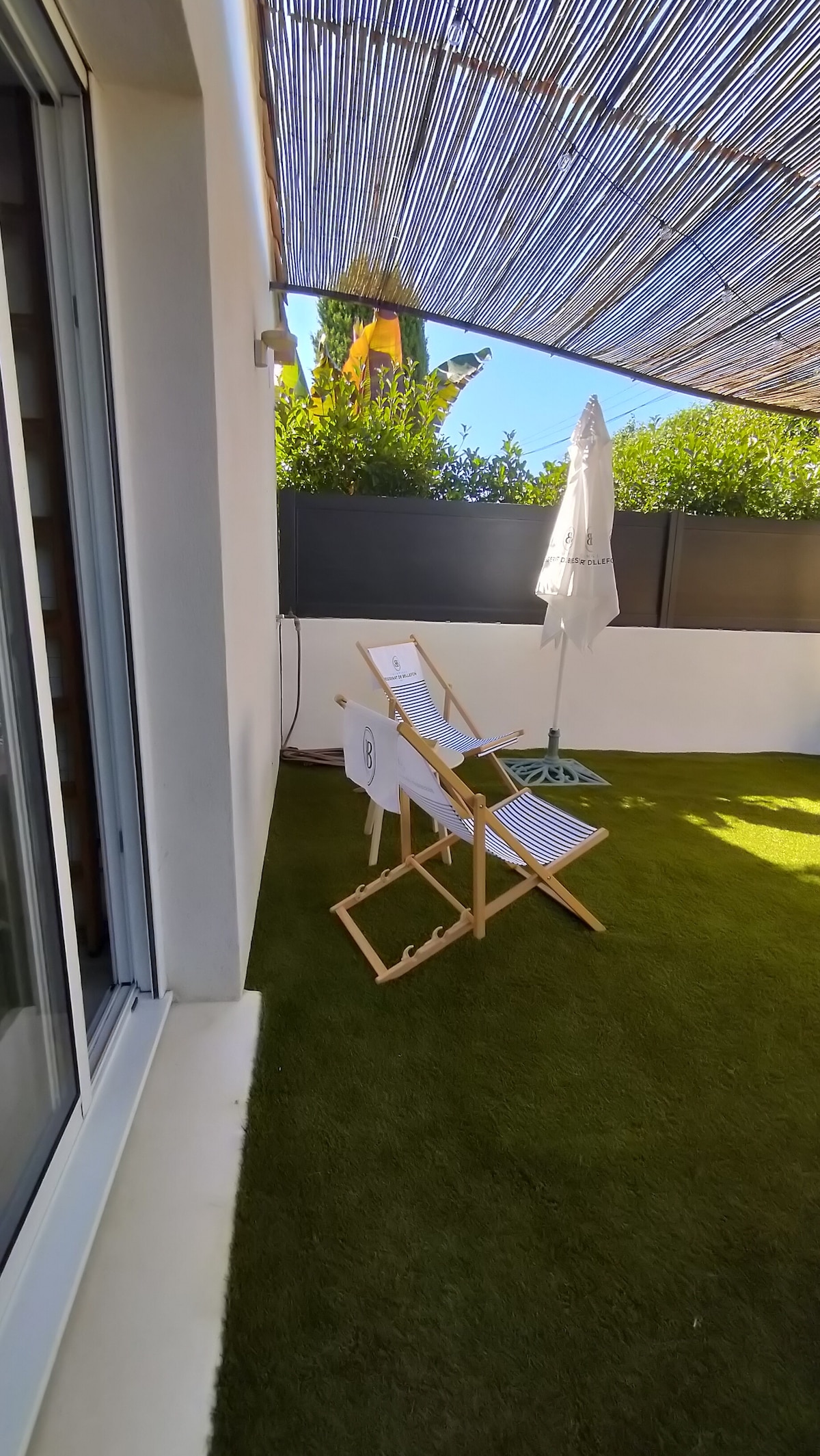 Grand appartement très calme, avec terrasse, barbecue et jardin. 4 couchages : 1 canapé lit 140cm dans le salon et 1 lit king size (180cm) dans la chambre. Coin bureau avec un wifi haut débit (fibre optique). Linge de lit, savon et serviettes comprises. Nombreux équipements (lave linge, lave vaisselle, climatisation, grille-pain, micro-onde, plaques induction, machine Nespresso avec capsules). Le parking gratuit et privé (possibilité de garer plusieurs voitures)