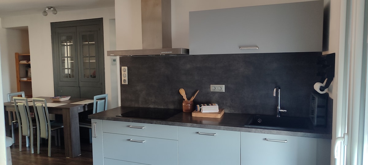 2-star apartment. You will find peace and serenity while having breakfast in the garden with a view of the Dordogne and the old bridge. Ideally located 3 km from Golf du Château les Merles and 25 km from Golf des Vigiers. You will also be 15 minutes from Bergerac, Issigeac. 30 minutes from Monpazier, Eymet. 1 hr from Sarlat. My cat and the neighbor's cats walk around in the garden.
