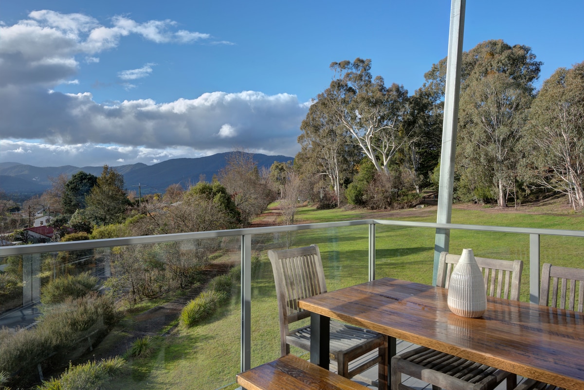 With spectacular mountain and valley views, make yourself at home and relax in this contemporary, sustainable design townhouse. Just a five-minute walk to the Mount Beauty town centre and a 40-minute drive to Falls Creek and Bright, it’s the perfect retreat after a day on the ski fields or exploring Victoria’s beautiful north-east. Go for a bike ride, ski or snowboard, swim or bushwalk in the scenic surrounds, or stay in and enjoy the views from the spacious decks.