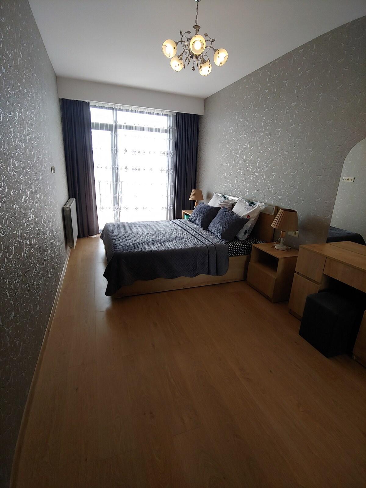 The apartment is in the Saburtalo district, near the Palace of Sports, Polytechnic University metro station, on the 9th floor, 60 sq.m., studio style with 2 bedrooms and a large terrace. Equipped with everything you need. If you wish, I can arrange tours around Georgia, the city and transfer