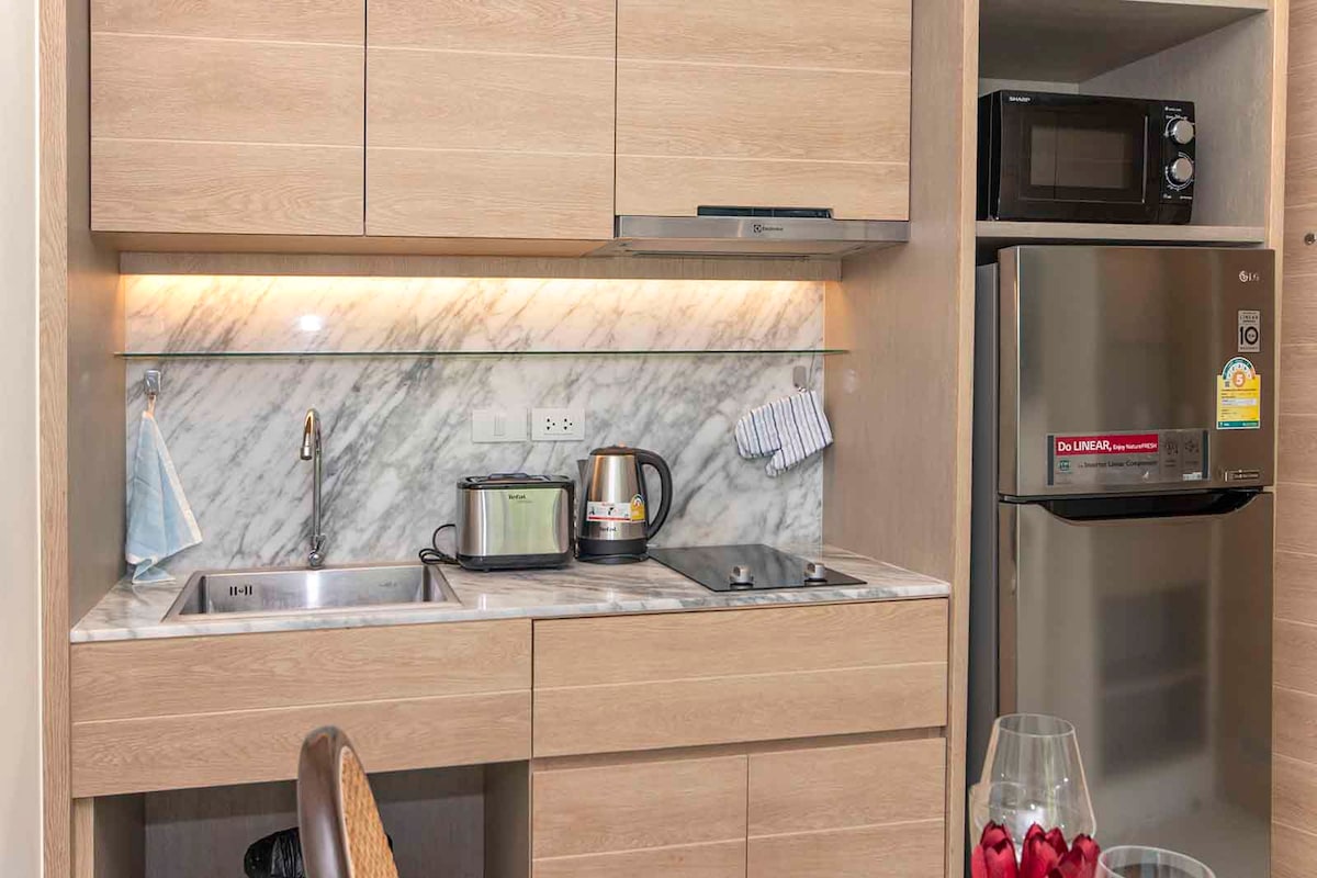 Stylish and fully equipped condo just 300m from Aonang Beach, yet set in a peaceful area. Perfect for up to 4 guests with breathtaking mountain views from the 5th floor. The building offers a large swimming pool, modern fitness center, sauna, two elevators, and 24/7 support. Located next to the famous Khunsek Muay Thai Gym. Scooter rental (Yamaha N-Max & Grand Filano) available from host(no deposit). Discounted tours to Maya Bay, Hong Island, Railay and more included!