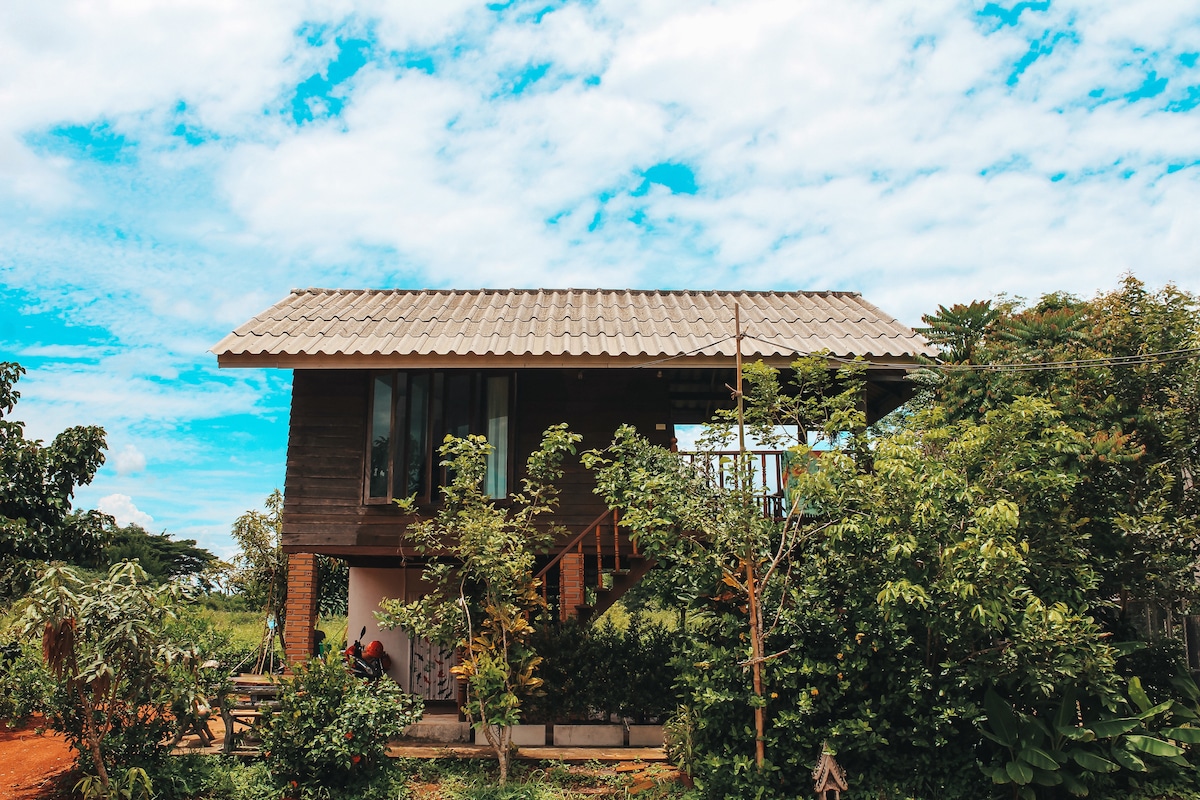 🌿 Two-story small wooden cabin surrounded by fruit trees. Tucked away next to our art studio, the kitchen on the ground floor provides a space for cooking. Go up the stairs reveals a natural connection with open balcony. With a bedroom that be opened to the wind, Stay close to the embrace of forest all day long. At dusk when the weather is cool, we sit around the bonfire, Let our hearts be warm. Listen to eternal stars, Blessed the energy from MotherNature (Pachamama) and Doi Luang ChiangDao