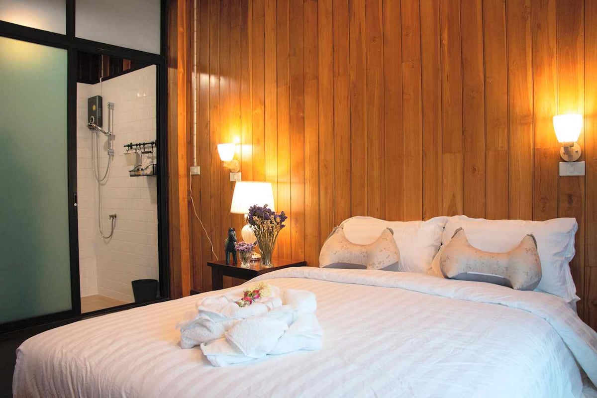 Private room with private bathroom in a century-old ancient house that has been repurposed and refurbished by the traditional charm for you to indulge in the atmosphere of old Thai homes where guests still have modern style comfort. Private room with attic and private bathroom in a hundred year old house that has been renovated and refurbished, retaining the original charm. Allowing you to indulge in the atmosphere of an ancient Thai house, where guests still receive modern comforts.