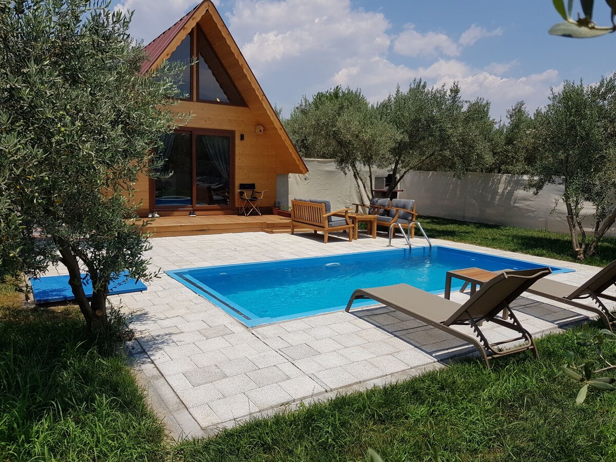 A fully detached house with a large garden, pool and mezzanine floor among fig trees. Our house has 2 double beds, one of which is on the mezzanine floor, and a corner sofa that can be opened in the open kitchen. It can accommodate up to 5 people. There are all the kitchen utensils that may be needed in the kitchen and a barbecue in the garden where we can enjoy barbecuing. It is 10 km from the city center. You can reach all beaches in 5 to 35 minutes by car.