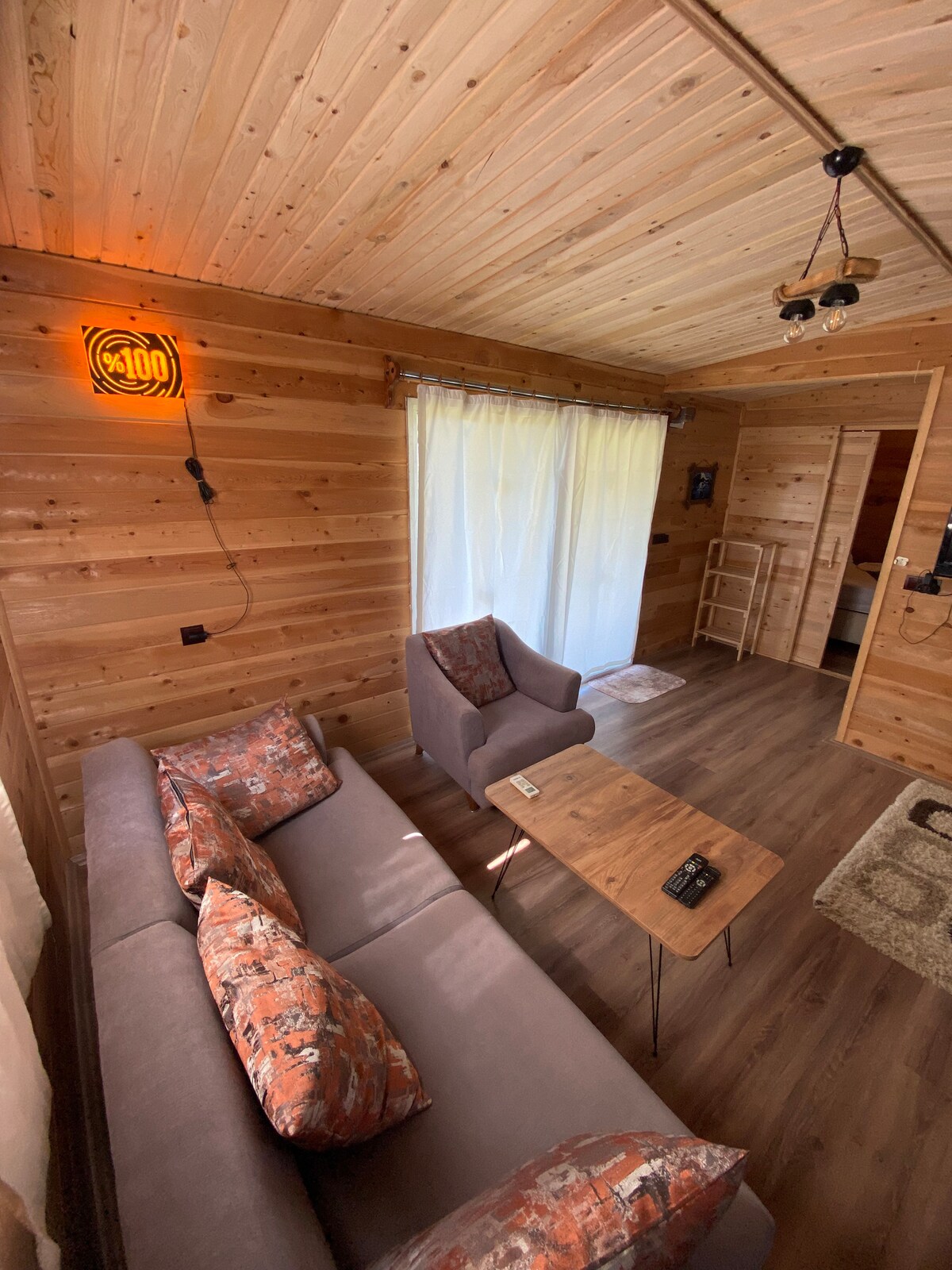 Detached, balcony, panoramic glass, 30 square meters of interior space, large ceiling, wooden, insulated, handmade, 70 cm above the ground, toilet with shower, mini fridge, sea view bungalow. On the vehicle road, with free parking, 150 meters above the sea, a total of 2000 square meters of magnificent sea view, designed in amphitheater style, 15 minutes walk to Kabak Beach. You can do your shopping and use the shared kitchen, there is a fridge, oven, stove and other kitchen utensils.