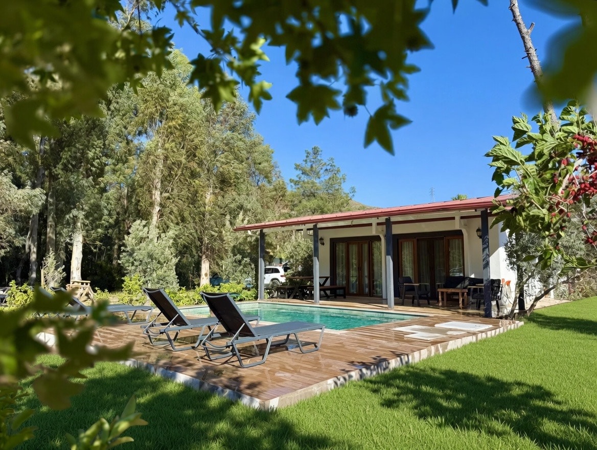 Our wooden villa with a private pool (heated in winter) in Hisarönü, Marmaris, allows you to have a quiet holiday with its garden and pool. It offers easy access to the beach in 5 minutes by car, to the bays of Marmaris in half an hour, and to Marmaris in 15 minutes. You can enjoy the organic fruits and vegetables in our garden and create pleasant memories with your family and friends using our barbecue. @alibabahomess
