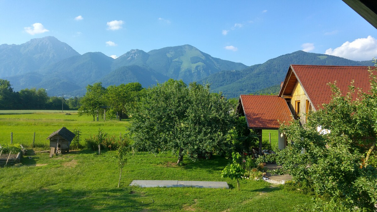 Our 70 m2 apartment is in a quiet place in the countryside, in the elevated ground floor and direct access to the (shared) garden with a view to the mountains. Two rooms, living room, bathroom, a kitchen with dining table and entrance. The garden is spacious, and you can use outdoor toys. There is also a treehouse for kids. Located 25 minutes from Ljubljana and 30 mins from Bled. A little closer the beautiful lake of Preddvor, Krvavec ski resort. 5 min. from the airport.