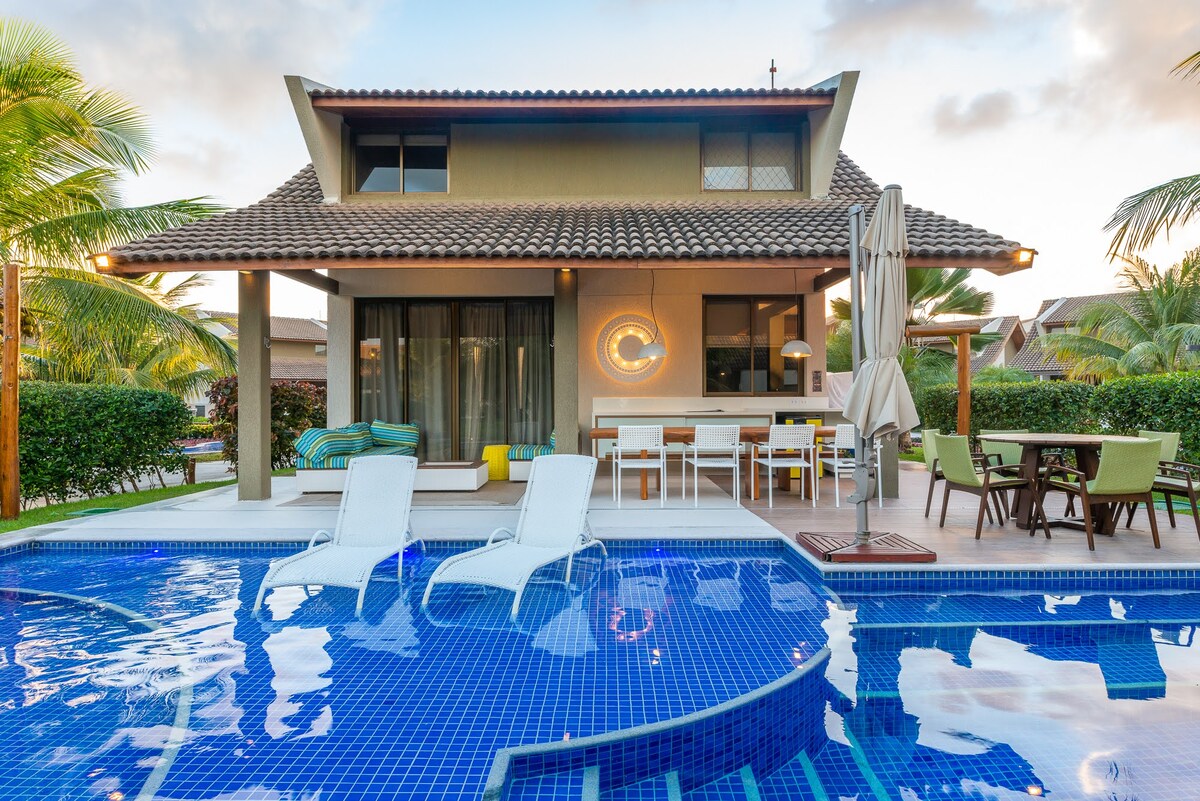New oceanfront bungalow with 7 bedrooms plus a service room, private pool, gourmet balcony, barbecue grill. Great place for unforgettable family vacations. Ideal place for those looking for comfort, peace and tranquility with security and complete condominium structure (running track, bicycle, gym, multi-sport court, clay tennis, beach tennis, cinema, toy library, movie room, game room, restaurant, convenience, 24-hour reception, maintenance team).