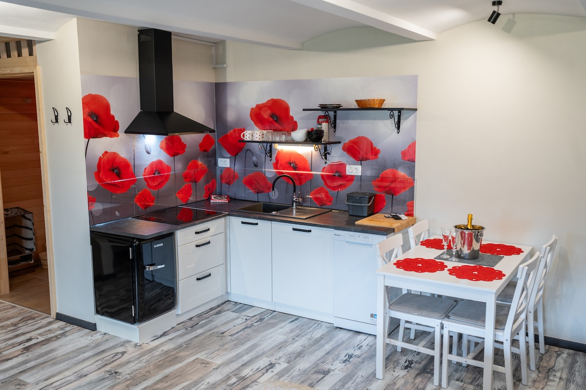 Enjoy at spacious outdoor place in rustic green environment, within walking distance of a large thermal complex and a golf course. This open-space appartment is entirely on the same level (including the shower in the bathroom); the passages between the individual parts are easy to pass also for disabled people. It shares a large yard and the garden with another apartment. Available are a grill and bicycles for wandering along the picturesque cycling trails in the area. Pets are wellcome.